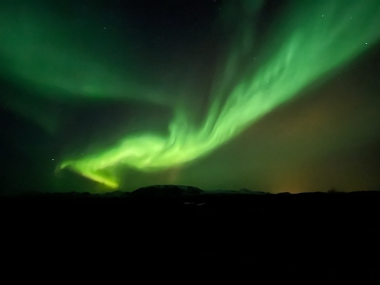 시작부터 오로라 투어는 정말 순조로웠다! 버스를 타고 싱벨리어 국립공원까지 달렸는데, 가는 중간부터 이미 오로라가 버스 바깥으로 얼굴을 내밀기 시작했다. 중간중간 버스를 멈춰 오로라를 보게 해 주셨는데, 첫 번째 빛이 위의 두 사진이다. 선명하지는 않지만 하늘이 맑아 반구를 뒤덮는 초록빛을 볼 수 있었다