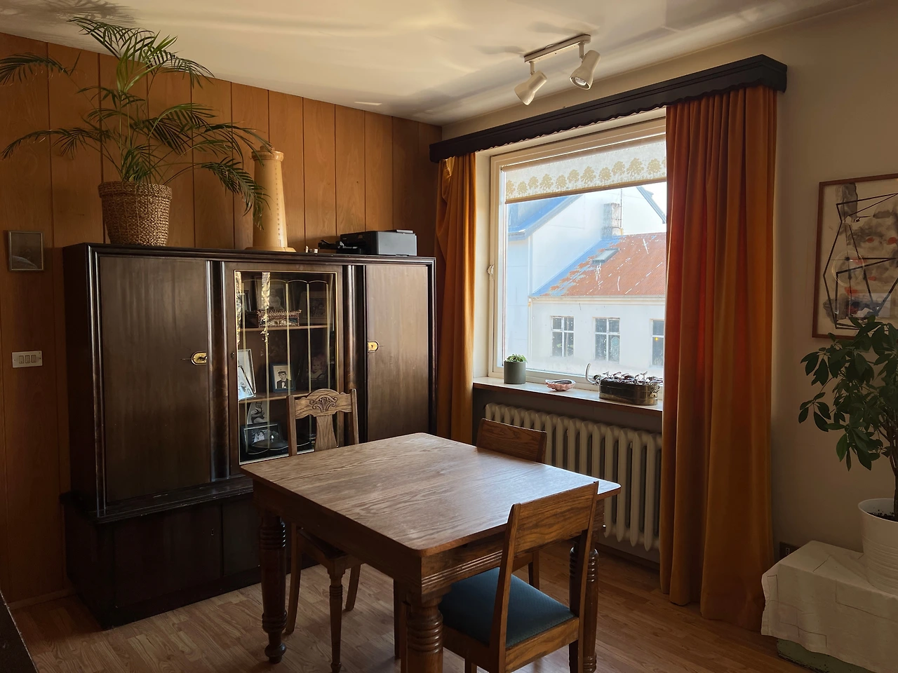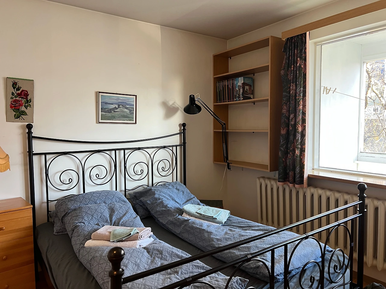 방도 정말 아늑하다. 건조하기만 하고 따뜻하지는 않을 거라는 예상을 깨고, 라디에이터를 5로 맞추면 훈훈한 공기가 가득해진다. 나무와 맞은편 집들이 보이는 큰 창으론 새벽과 저녁 파란빛이 들어온다. 호텔 침구 못지않은 침대와 이불, 다정한 나무 가구들이 예쁘다!
