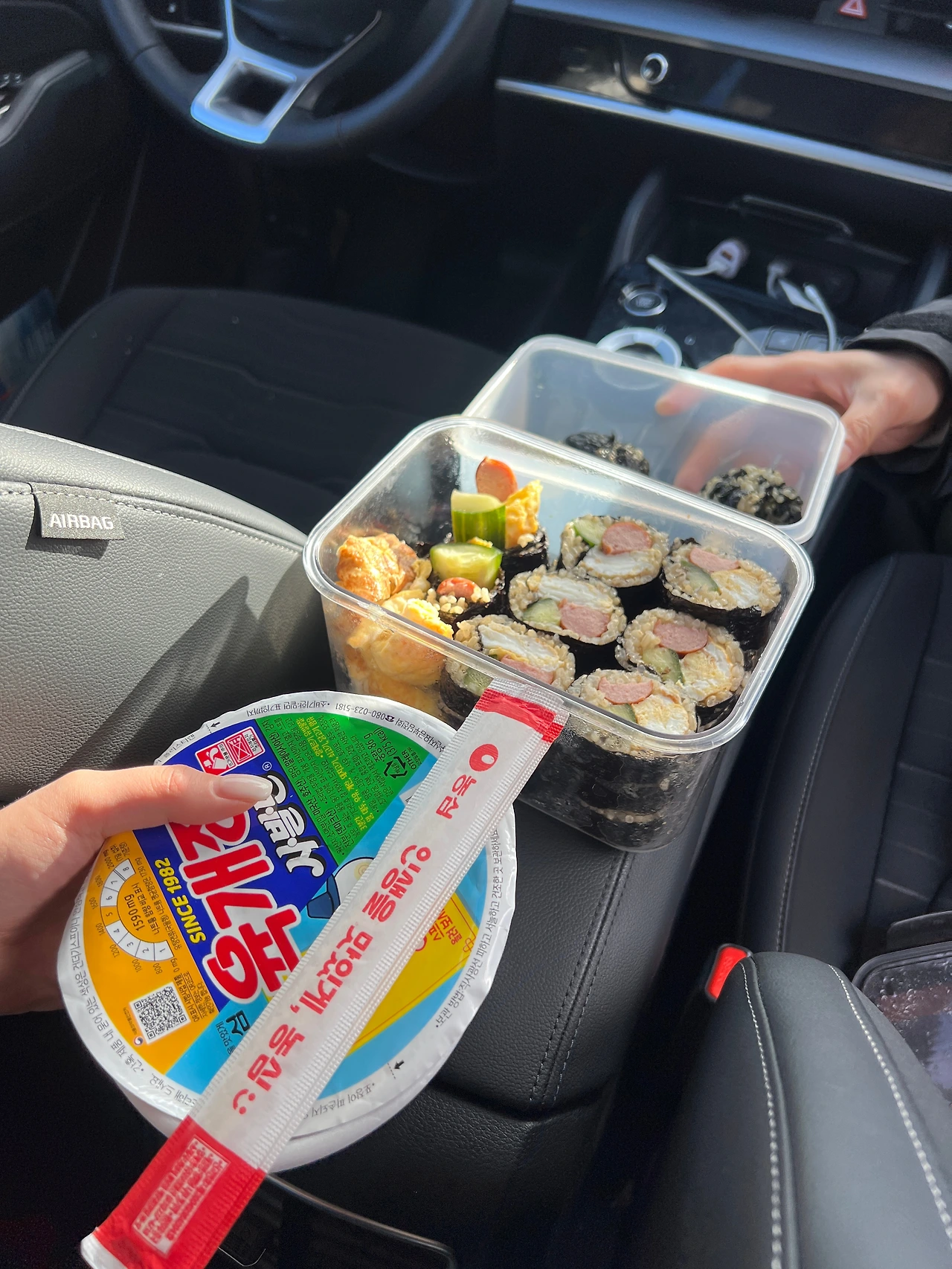 다음 목적지로 향하기 전에 먹은 점심. 엄마가 보누스 마트에서 소시지와 오이를 사고, 계란을 부쳐 김밥을 쌌다. 육개장과 먹으니 이게 바로 소울푸드...