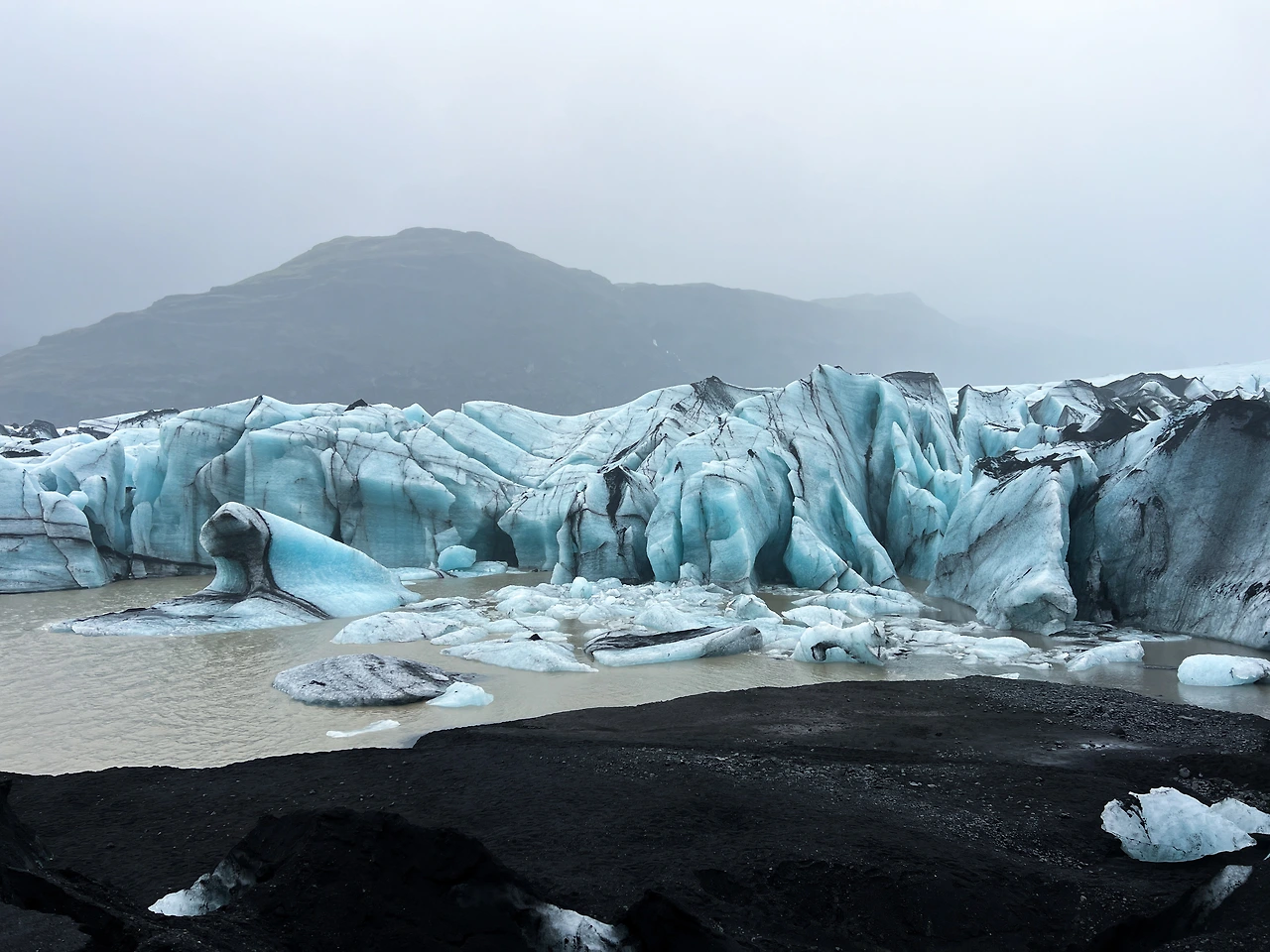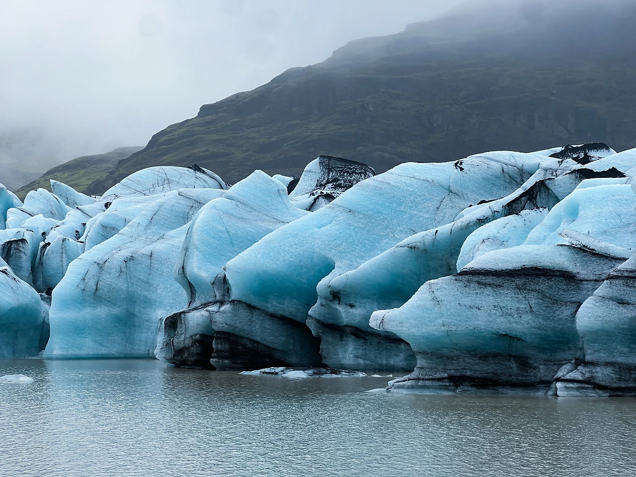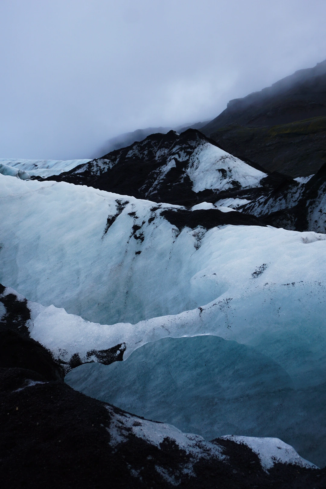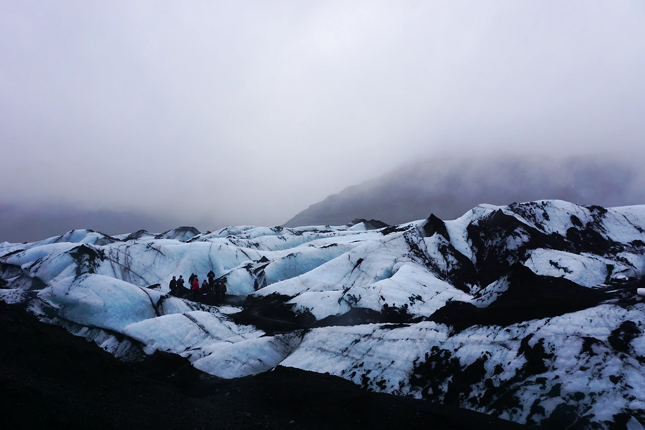 백 년 전 폭발한 화산재가 빙하 위를 덮고 있어 마치 수묵화의 한 장면처럼 보인다. 날씨가 흐렸음에도 수천 년의 세월을 담고 있는 딱딱한 빙하는 청자처럼 푸른빛을 보였다. 오히려 안개가 잔뜩 낀 덕분에 신비로운 분위기가 느껴지기도 했다.