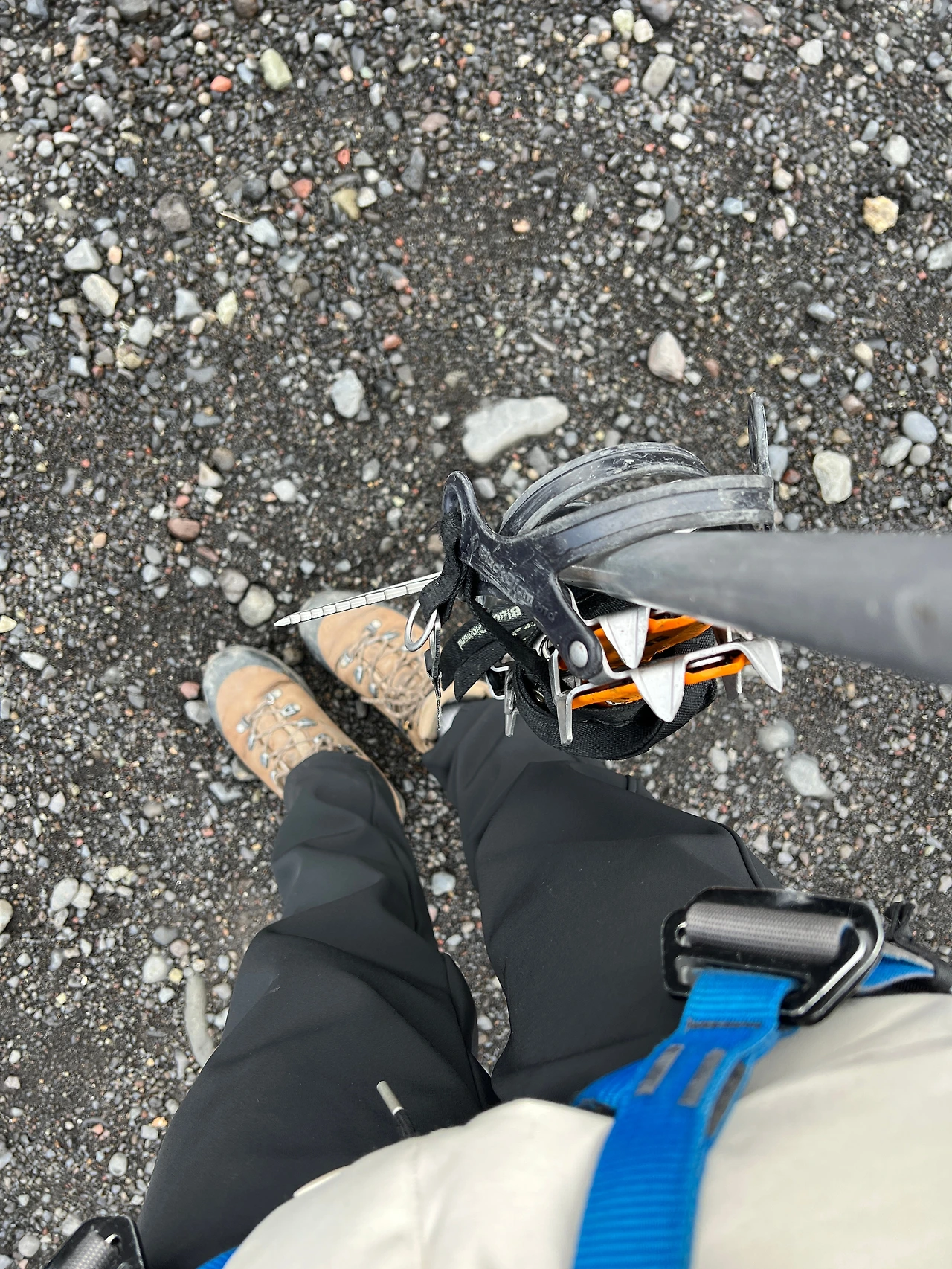 안전모를 쓰고, 강아지에게 채우는 것과 동일한 구조의 하네스를 착용하니 마지막 관문은 아이젠이었다. 스쿨버스가 있는 곳부터 빙하까지는 약 20분 거리였기에 우리는 기다란 낫처럼 생긴 장비에 아이젠을 끼고 먼저 이동했다. 저 낫(이름을 잘 모르겠다!)은 사실 쓸 일은 거의 없었고, 탐험가처럼 보이는 사진을 찍는 데에만 유용하게 쓰였다.