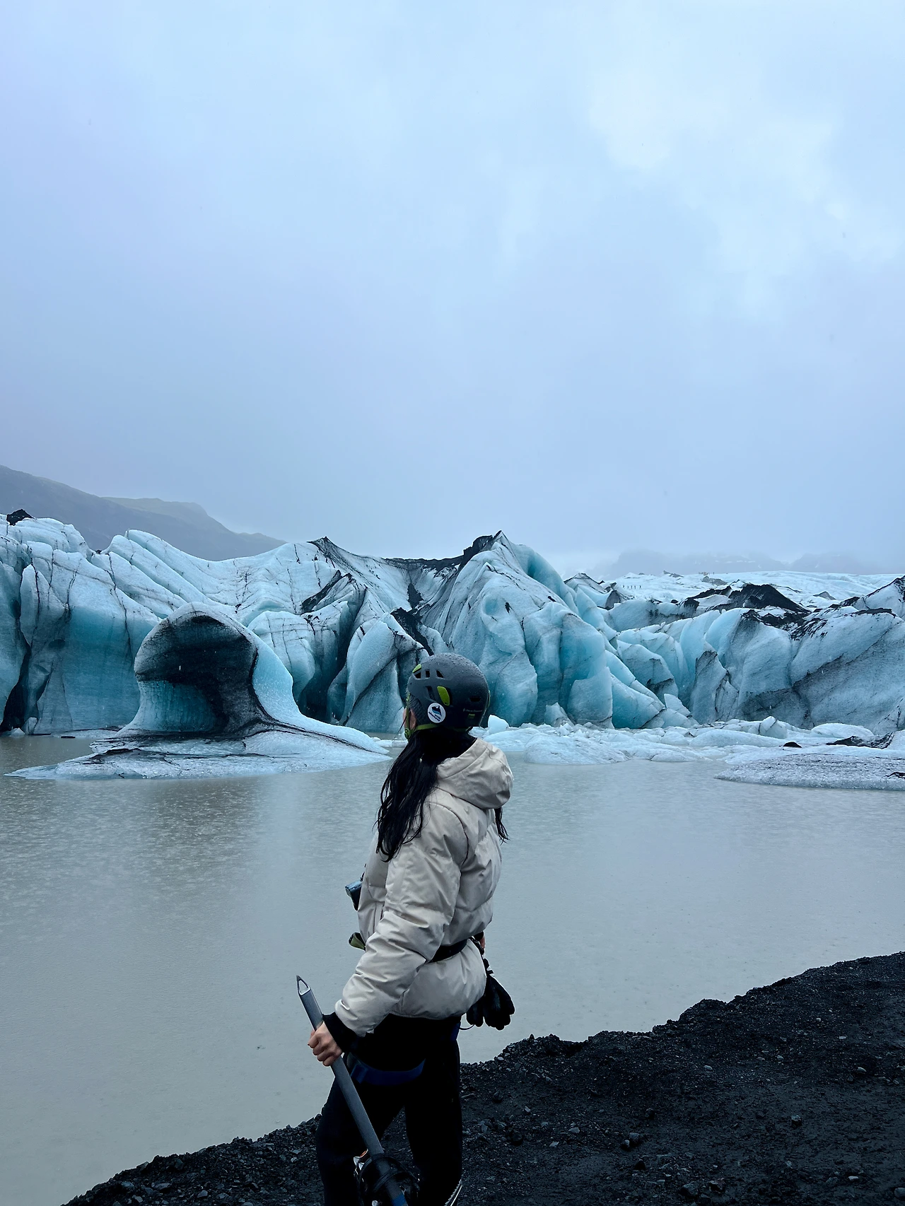 그런데 이동하는 중간부터 갑자기 생각보다 거센 비가 내리기 시작했다. 내 패딩은 스키 패딩이지만 방수가 되지 않는 재질이라 겉면이 계속 빗방울로 축축해졌다. 들고 간 카메라 렌즈에도 자꾸 빗물이 묻어 안경닦이로 닦아내면서 저벅저벅 빙하로 향했다. 빙하 탐험을 하고 싶은 분들이 있다면 신발은 가볍게 신고 여기 와서 대여를 받는 것을 추천하고, 꼭 방수가 되는 옷을 입고 오길 바란다!