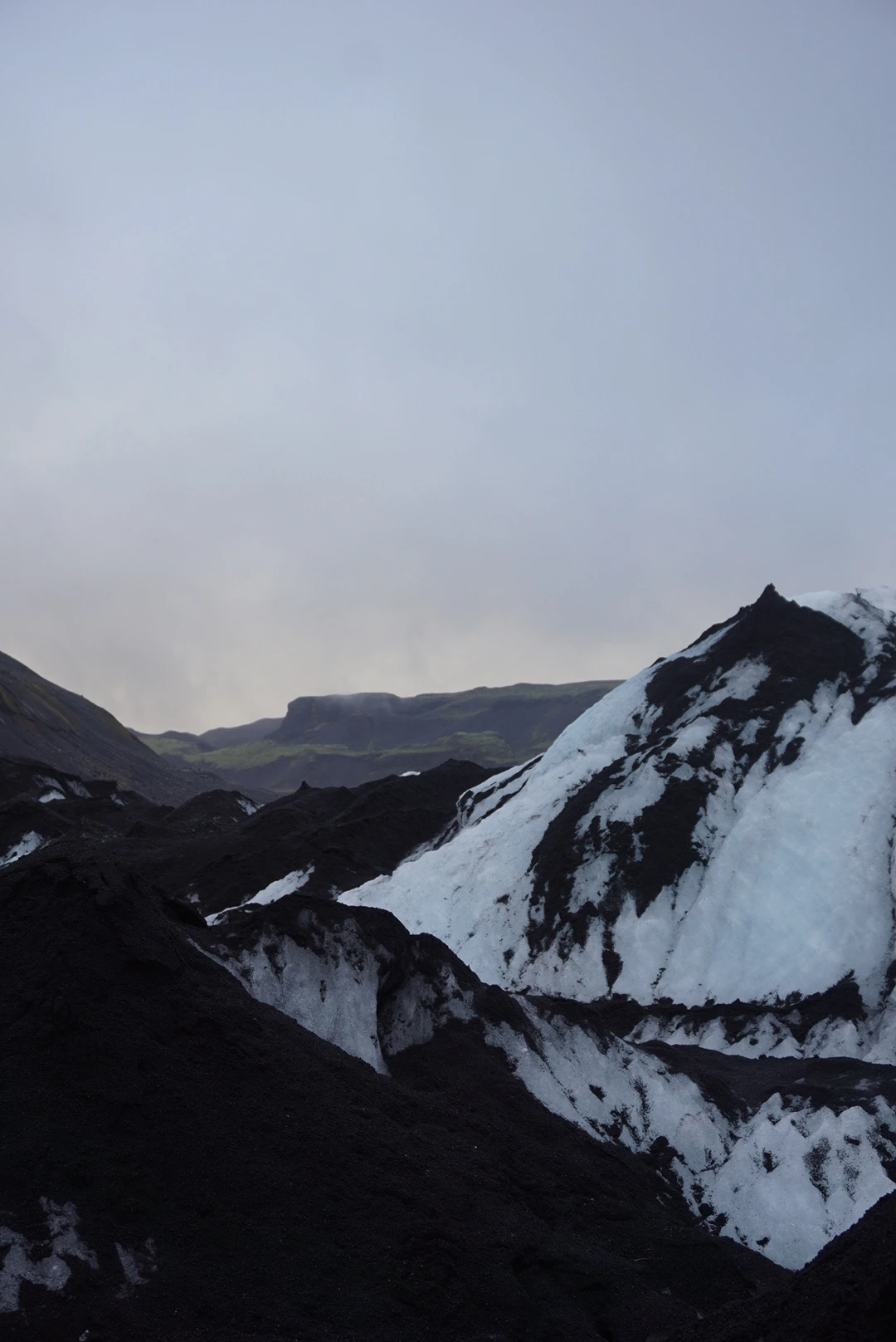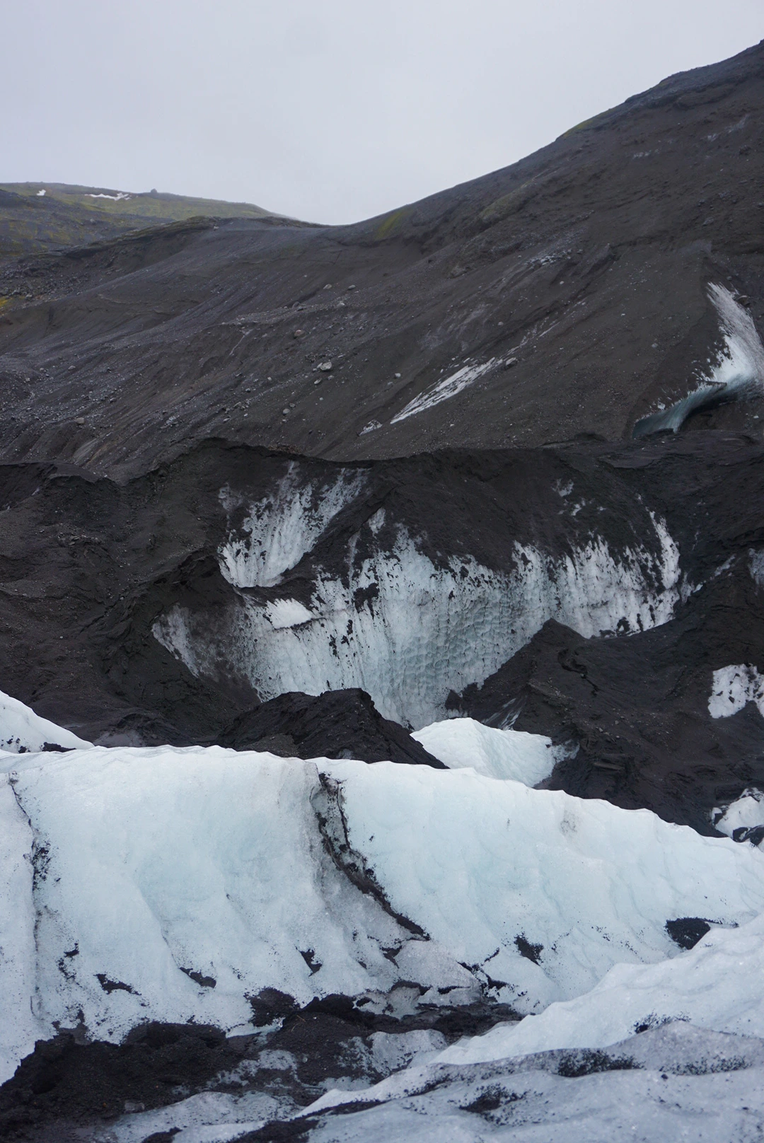 다른 빙하는 깨끗하고 푸른 얼음으로만 이루어진 경우가 대부분인데, 우리가 걸어 올라갔던 솔헤이마요쿨은 바스러지는 화산재가 가득 덮여 있어 오히려 뜻밖의 아름다움이 있었다. 얼음의 굴곡과 재의 굴곡이 만들어내는 차이가 절묘하게 어울려 독특한 그림 속에 들어와 있는 듯했다.
