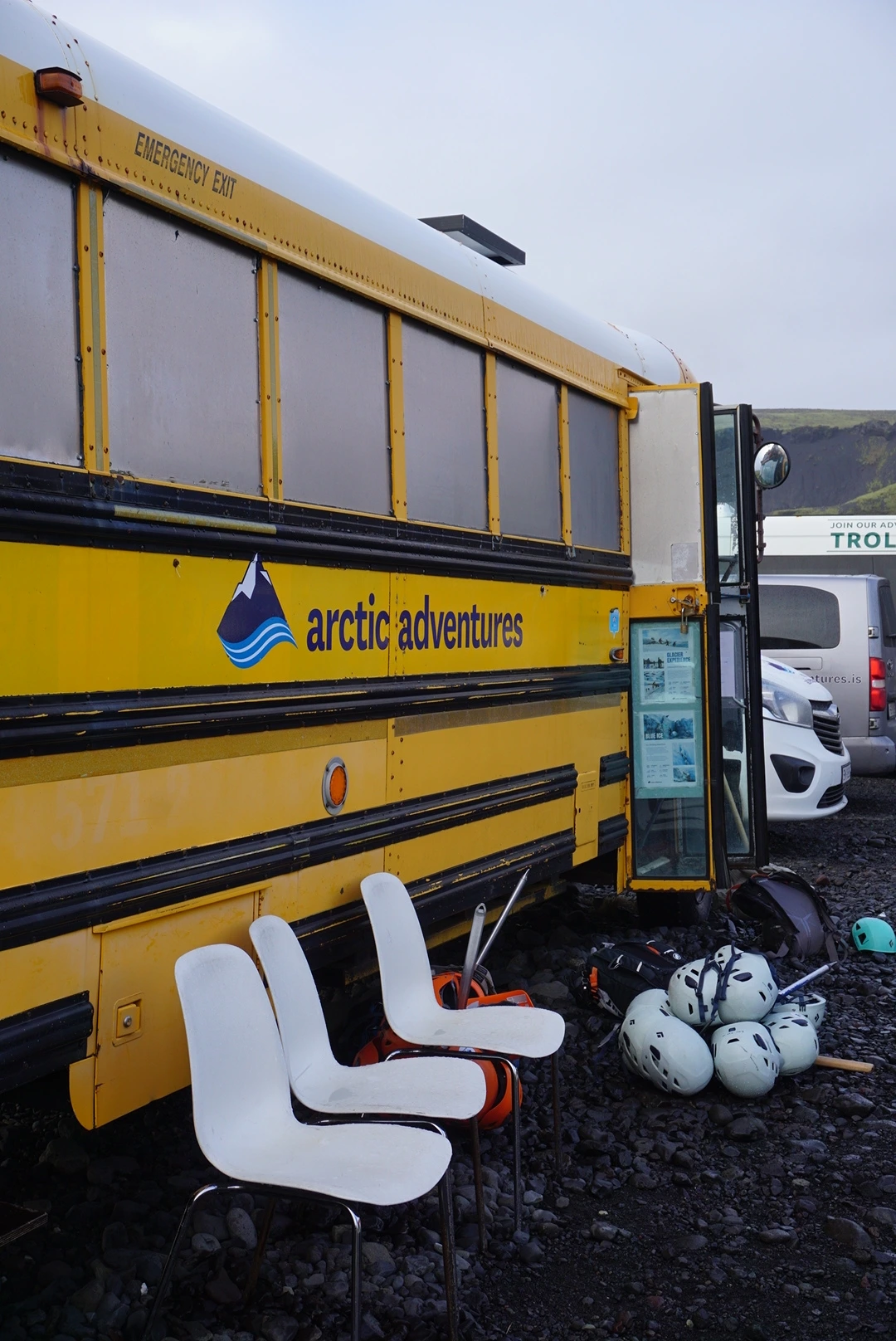 적당히 아이젠만 끼고 오를 것이라는 예상과 다르게, 4시간 투어 중 준비만 거의 2시간이 걸렸다. Arctic adventures라는 회사에서 예약을 했고 노란 스쿨버스 앞에서 정해진 시간에 만났는데 사람이 많아 안전모 색을 기준으로 두 팀으로 나눴다. 한 명씩 나무 의자에 앉아 지금 신고 있는 신발이 적합한지, 새로 등산화를 대여해야 하는지를 확인받았다. 방한 부츠를 신고 간 나는 부적합 판정을 받았고 결국 사진에 보이는 낡은 등산화를 빌려야 했다. 다행히 대여 비용은 15,000원! 그래도 발목을 튼튼하게 받쳐 주는 신발을 신으니 마음이 한결 가벼웠다.