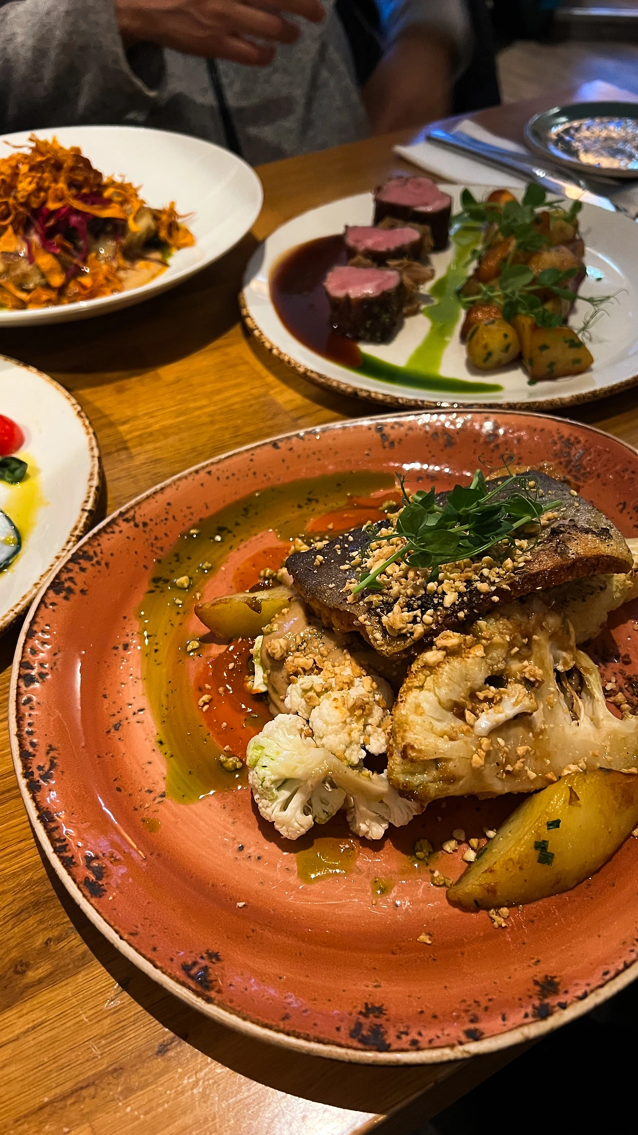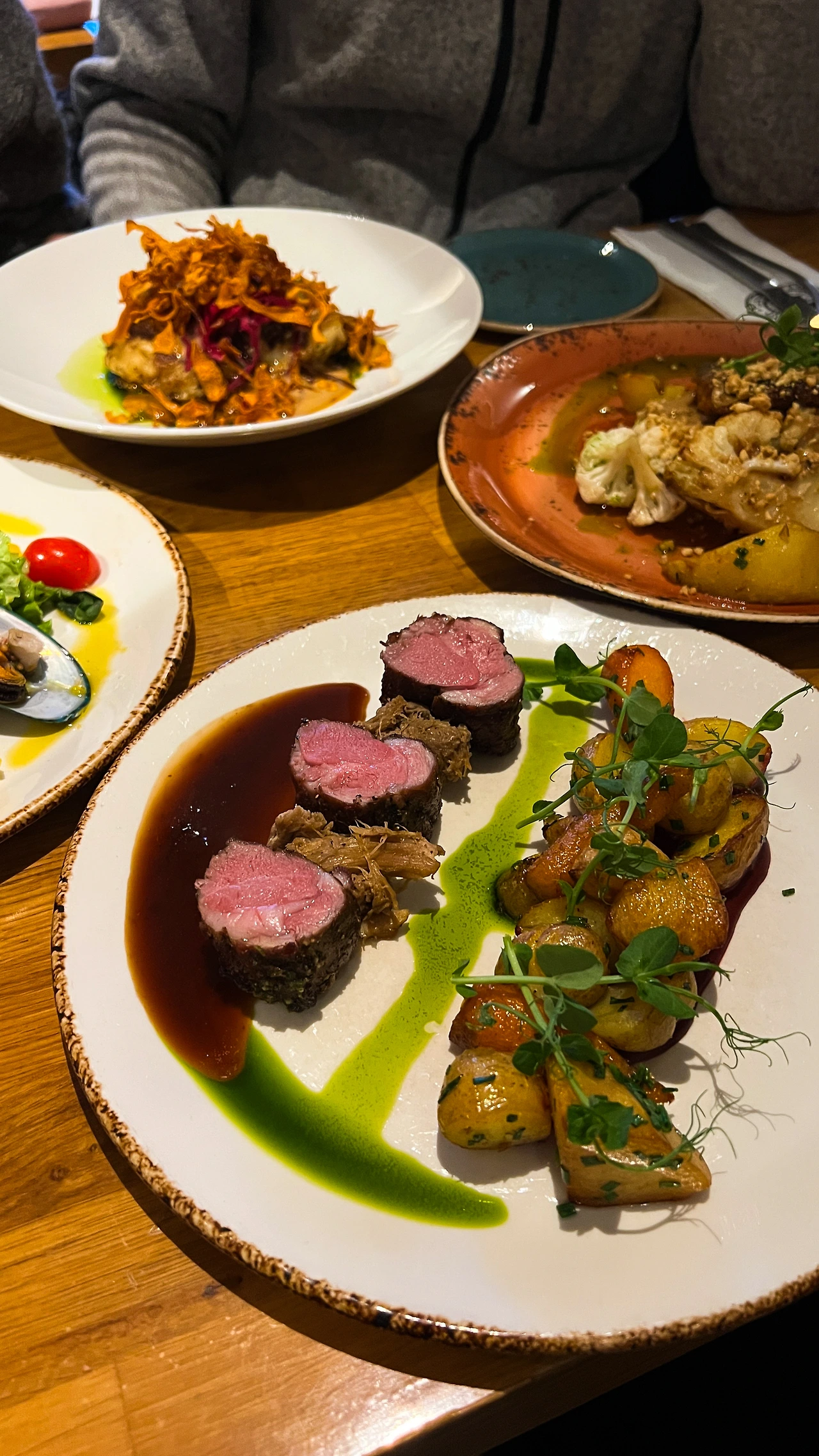 축축한 옷을 입고 식당 안에 들어서자 친절한 웨이터가 자리로 안내했다. 밖과 다르게 안은 포근했다. 곧 나온 음식들은.... 정말 맛있었다! 여러 소스를 다채롭게 써서 각 음식의 맛이 예측을 벗어났고, 처음 먹어보는 보드라운 북극 곤들메기는 살결이 부드러우면서도 껍질이 바삭했다. 적당히 노릿한 양고기와 접시를 가득 채운 구운 채소가 감탄스러웠다.