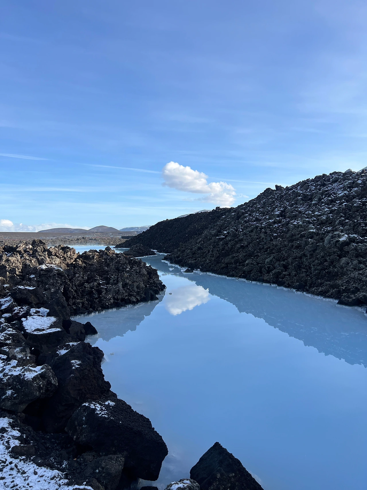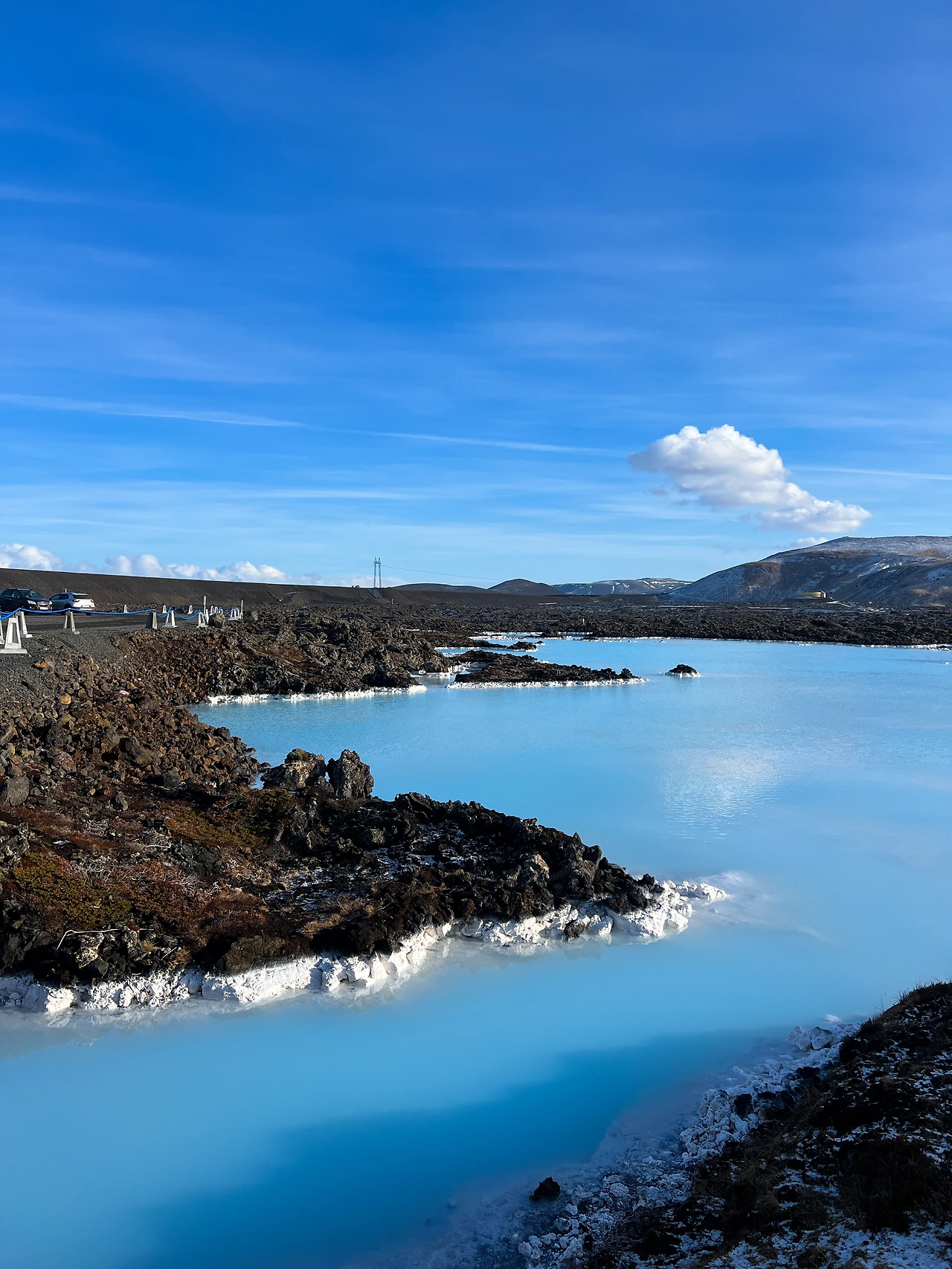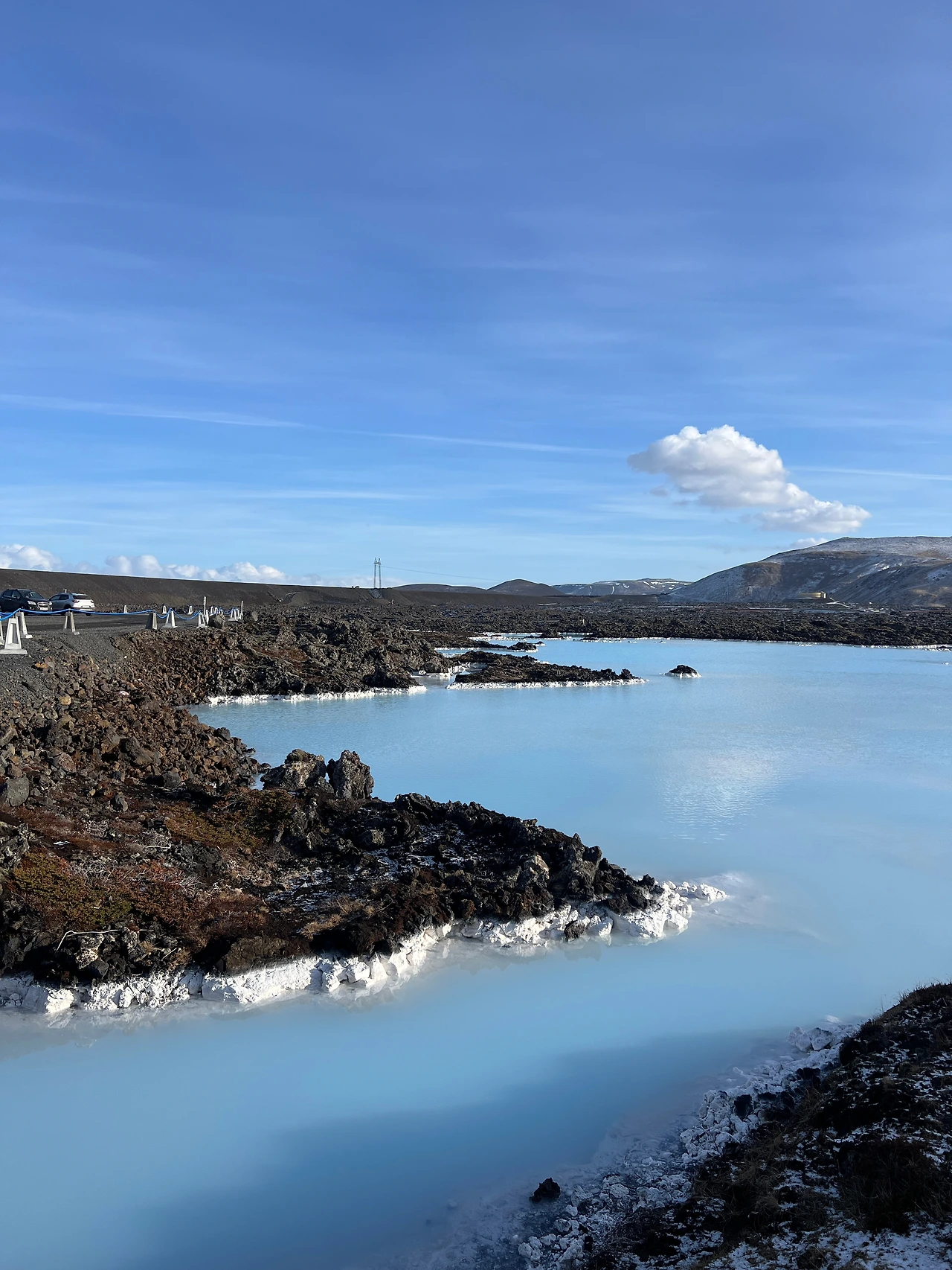 우리 가족이 가장 많이 기대했던 것은 블루라군! 지열로 데워져 미네랄이 가득한 푸른 온천수로 유명하다. 따뜻한 날씨 가운데에도 마침 며칠 전 눈이 와 약간의 희끗한 풍경이 남아 있는 것도 운이 좋았다. 아침에는 흐리다가도 오후엔 맑게 개어서 푸른 하늘과 하늘색 물의 조화가 아주 아름다웠다.
