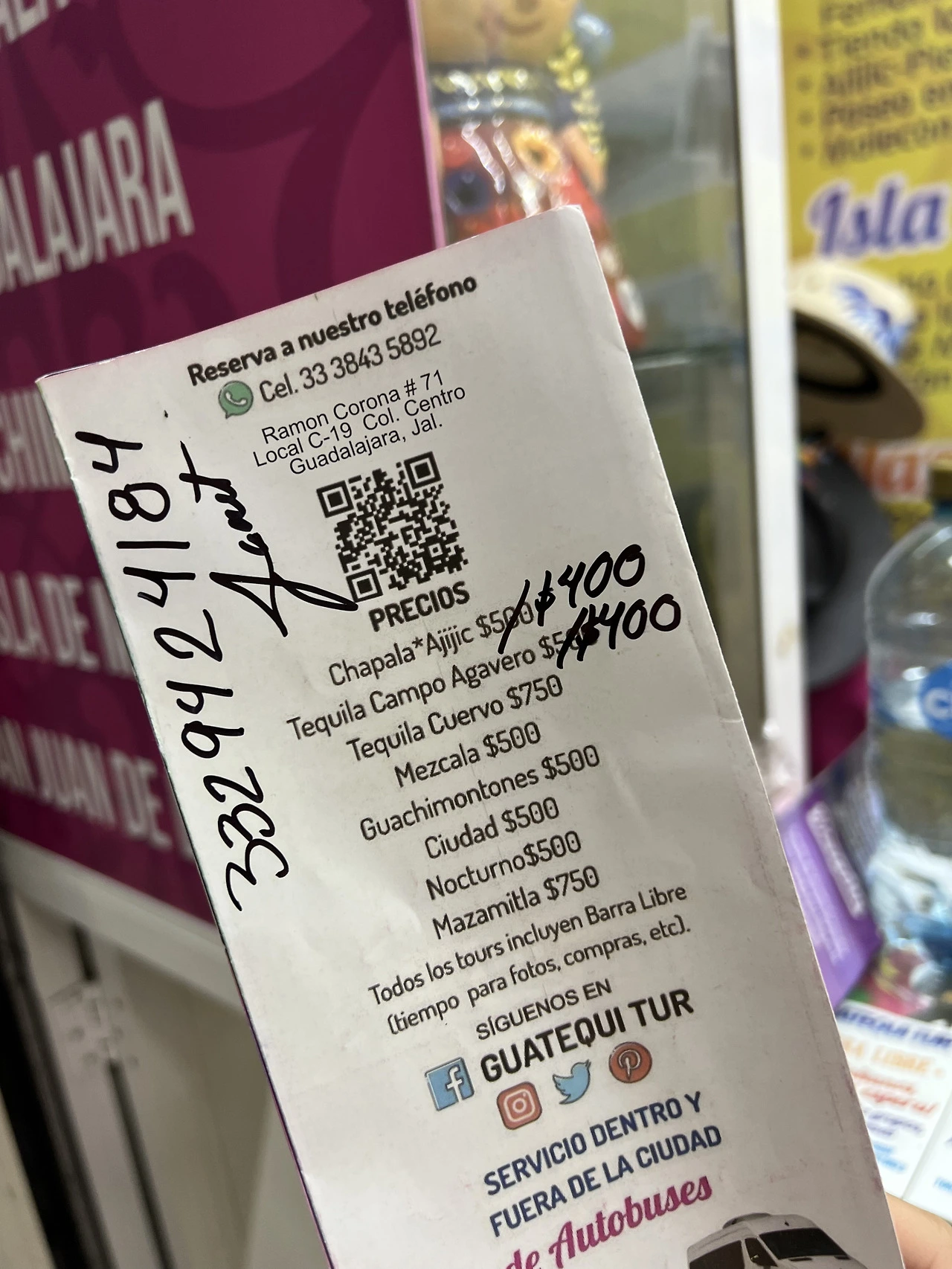 원래 1인 500페소 정도 하던 걸 이리저리 잘 깎아서 400페소, 인당 3만 원대로 예약 성공! 언제 어디서 만날 지를 알려주시니 시간 맞춰 광장으로 나가면 된다.