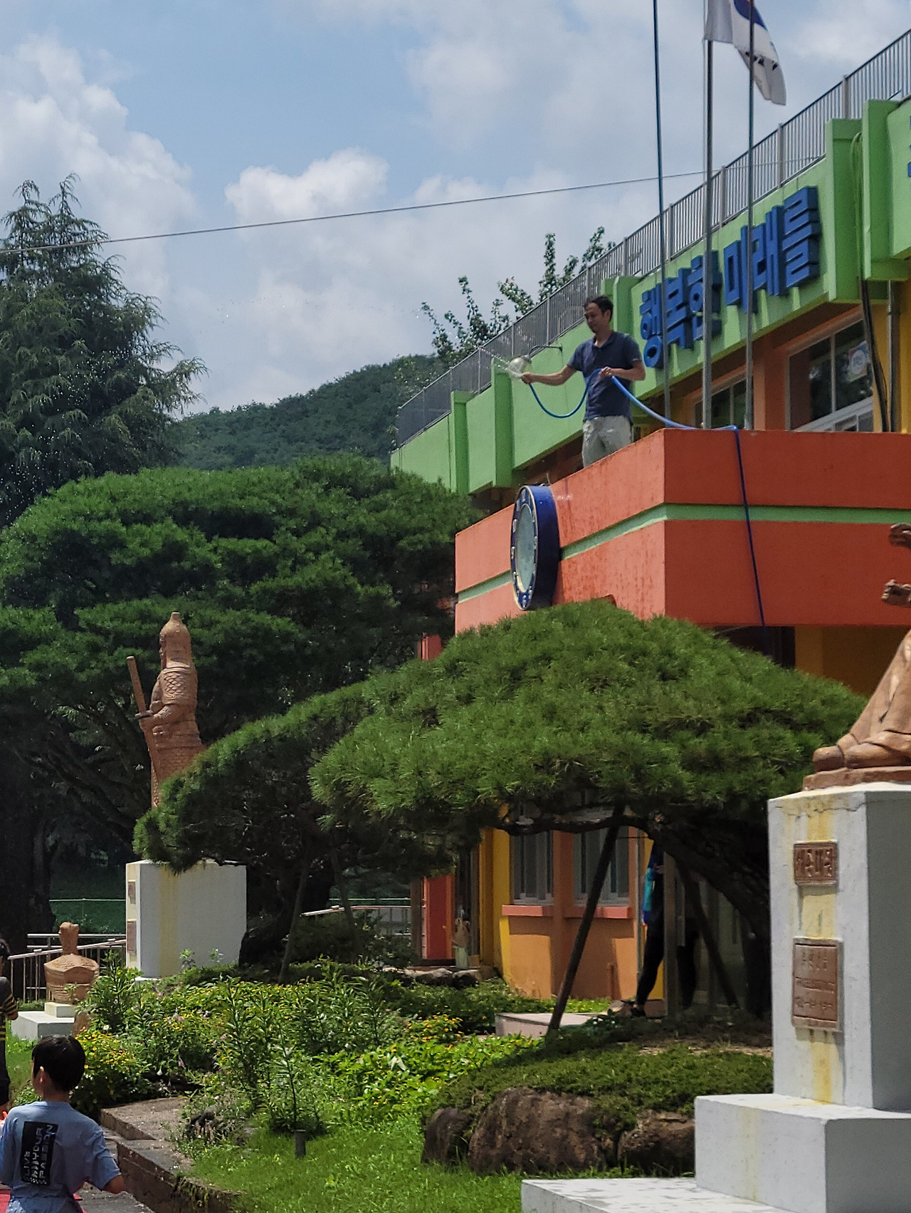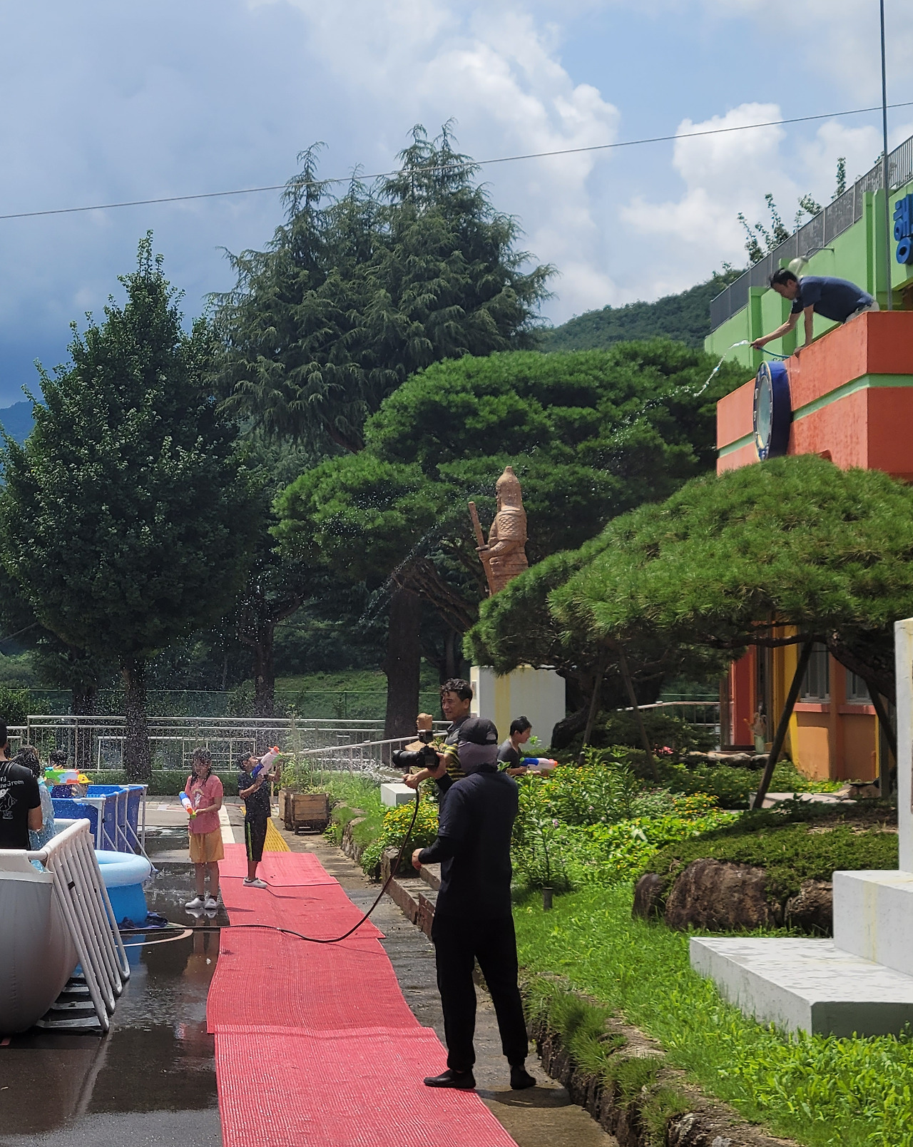 모든 선생님이 흠뻑 젖을 준비를 하셨더라고요. 2층에서부터 호스를 들고 물을 뿌려 주는 선생님, 바가지와 물총으로 애들과 열심히 놀아주는 선생님, 난리통의 현장을 촬영해 주는 선생님… 모두들 정말 신이 난 아이들과 같이 즐겁게 시간을 보내주고 계셨습니다.