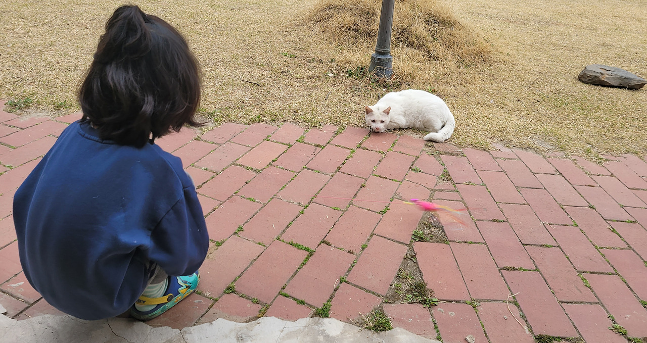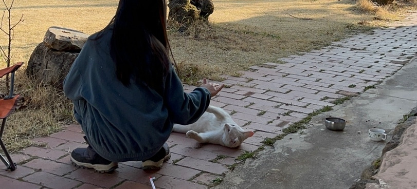 집에서 키우던 고양이였을까요? 개냥이인 듯 애교도 부리고 말을 걸면 대답도 해줍니다. 왠지 퇴청까지 올라오며 쳐다보는 걸 보니 집안으로 들어오고 싶어 하는 눈치예요. 그건 어려울 것 같아 정중히(?) 거절하니 슬쩍 내려가 줍니다.