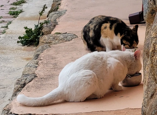 그러기를 며칠이 지나자 두 마리의 고양이가 밥 먹는 모습을 보는 걸 허락해(?) 주었습니다. 그리고 외출해서 돌아오면 '애미야, 밥그릇이 비었다.' 하는 것 마냥 눈에 아주 잘 보이게 숨어서 "야옹"합니다. 이 둘을 하양이와 얼룩이로 이름을 지어주었어요.(아주 직관적이죠.)