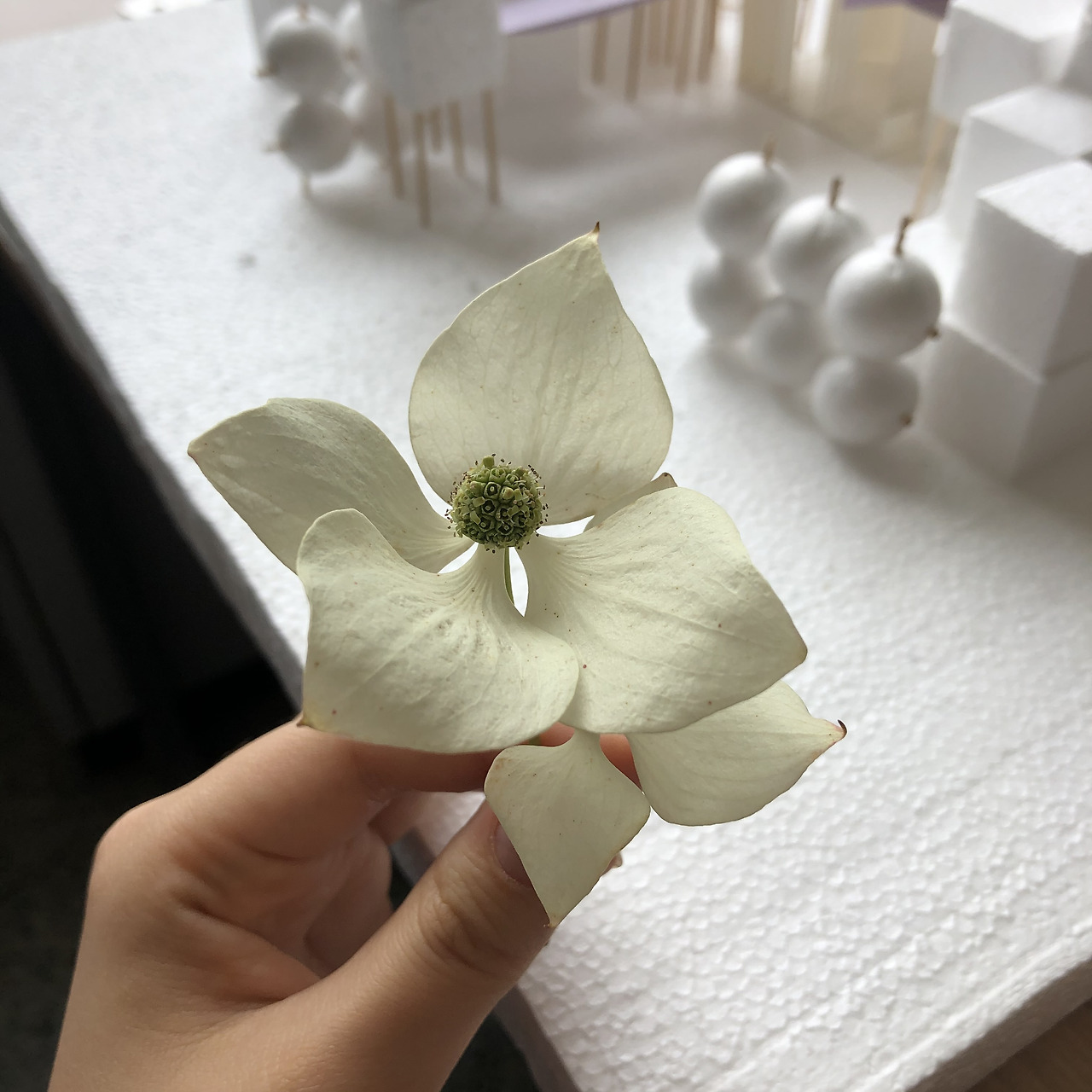 사실 산딸나무의 꽃은 가운데의 동그란 부분이다. 우리가 생각하는 희고 우아한 부분은 꽃잎이 아니라 꽃차례를 감싸는 포이다. 꽃 수십 송이가 모여 조금 더 큰 공 모양을 만들었음에도 한 송이 한 송이의 크기가 워낙 작아서 눈에 잘 띄지 않고, 곤충들을 유혹하기엔 역부족이다. 그래서 포를 크고 아름답게 변신시켜 꽃잎처럼 보이도록 만든 것이다. 산딸나무꽃은 존재감이 미미한 본인을 보완해 줄 수 있도록 주변의 것을 최대한 활용하거나 변화시켰고, 결국은 곤충들과 나의 시선을 사로잡는 것에 성공하였다. 원래가 부드럽고 청순한 얼굴인 줄 알았는데 누구보다 영리하고 치열하게 탈바꿈한 결과라는 것을 알고 나니 더 경이로울 수밖에.