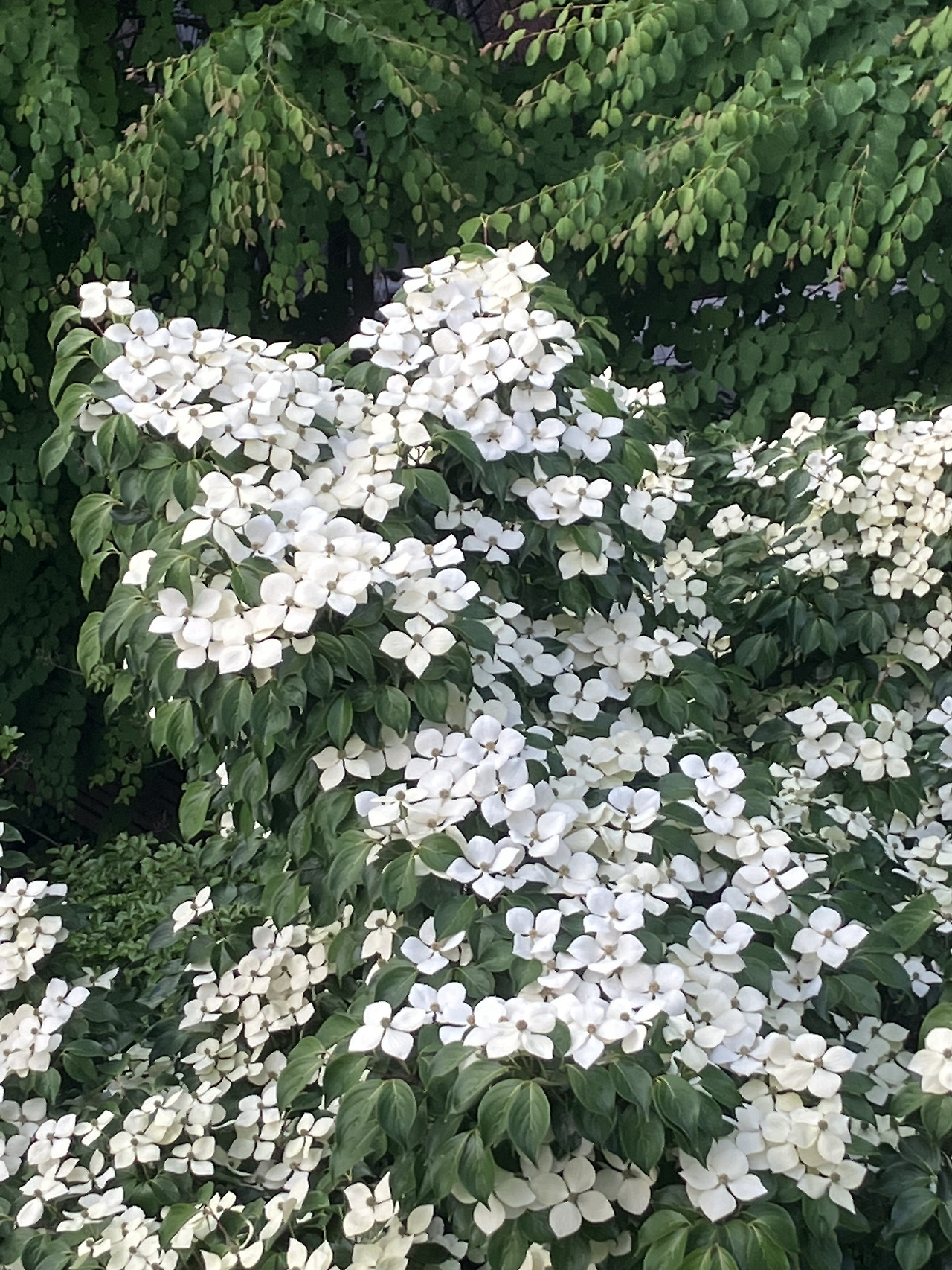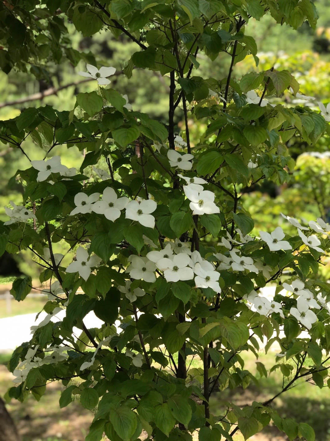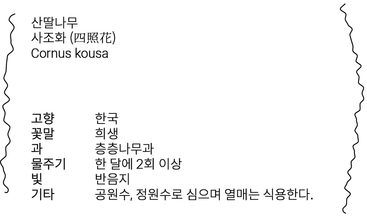 나는 졸업을 하고 나서도 학교 근처에서 2년을 넘게 살았고, 5월 끝자락이면 슬슬 산딸나무에 꽃이 피었을까 확인하러 광장에 들렀다. 산딸나무꽃을 보면 어쩔 수 없이 버거웠던 그때가 생각나고 서로를 챙기던 그때의 친구들이 생각나고, 한 템포 멈추고 후 숨을 고를 수 있다. 해의 반이 이만큼 지나갔구나, 작열하는 여름이 곧이겠구나. 5월 말에서 6월 상순, 이팝나무꽃이 지고 나면 산딸나무가 순백의 꽃을 피운다. 사조화(四照花)라고 부르기도 할 만큼 꽃이 피면 사방이 환하다. 가로로 층층이 포개어지는 것이 무리 지은 새 떼가 날개를 펴고 나는 것처럼 보이기도 한다. 새로 이사한 집은 다 좋은데 내가 이렇게나 좋아하는 산딸나무가 근처에 없다는 것이 아쉬울 따름. 대신 우연한 만남엔 기다리는 나에게 더 큰 기쁨을 가져다주겠지.