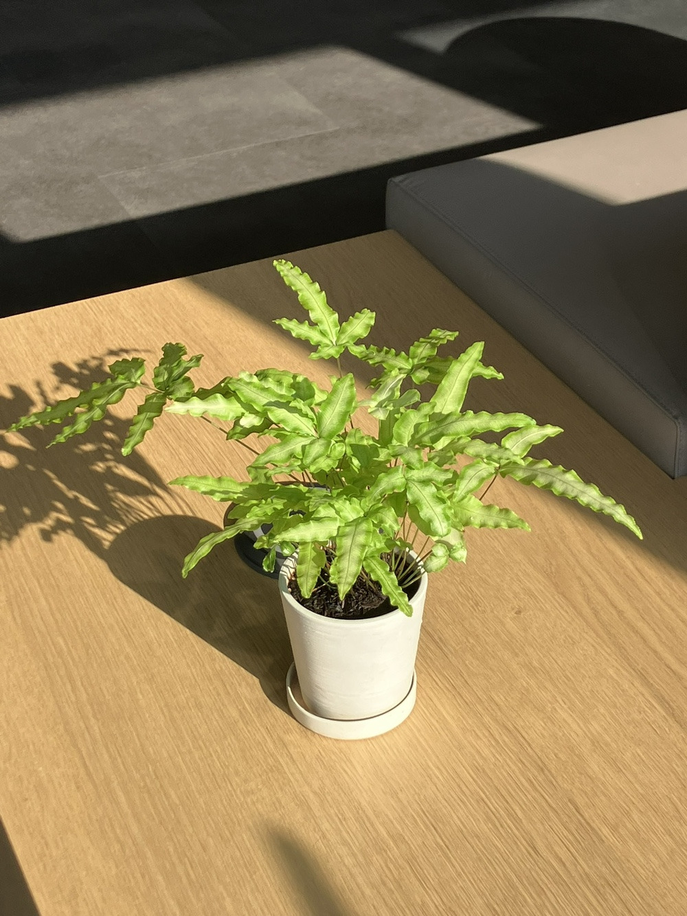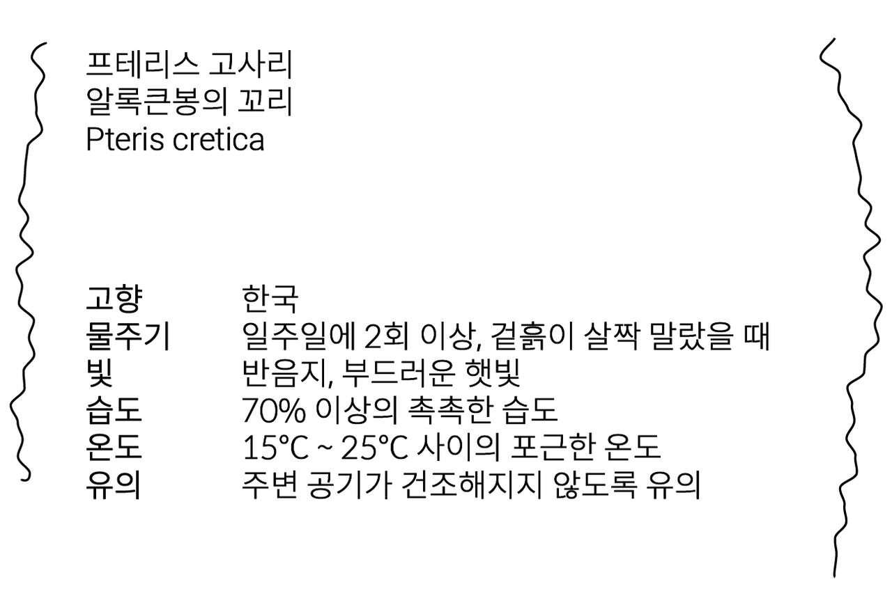 주말에는 물을 못 준다는 생각에 금요일이면 걱정이 되는 고사리가 있다. 사내 꽃 기부 행사로 열린 플라워 마켓에서 오천 원을 주고 데려온 아이다. 아름다운 색과 향으로 미모를 뽐내는 꽃다발용 꽃들도 많았지만, 내 눈에 들어온 것은 구불구불한 물결 모양 잎을 가진 프테리스 고사리였다. 잎 둘레를 물감으로 덧칠한 것처럼 가장자리만 조금 더 진한 초록이다. 화분을 감싸고 있던 비닐을 벗기고 나니 얇고 기다란 줄기 몇 개가 곡선을 그리며 아래로 풀썩 내려와서 더 멋스러운 모양이 되었다. 이전부터 내 방에 식물 하나를 초대해 볼까 생각해왔지만, 식물을 산 것도 내가 직접 키우는 것도 이제서야 처음이다. 식물에 무지한 내가 햇볕이 잘 들지 않는 방 안에서 홀로 키우다가 미안한 마음만 들 것 같아 매번 주저했는데 사무실에서 키워볼 작정으로(공동 육아) 용기 내어 구매하게 되었다. 내가 무언가 잘못하고 있다면 말려주고 도와줄 식물 전문가가 내 옆자리에 앉아 있으니까! (옆자리 매니저에게는 플로리스트 자격증이 있다.)