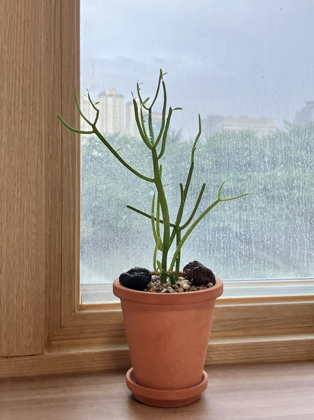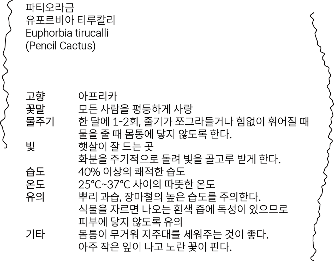 오후에는 책방에 들러 마음에 드는 책 두 권을 사고 근처의 식물 가게에 갔다. 사실 오늘 하루의 가장 커다란 미션이 바로 집에 둘 식물을 사는 것이었다. 플랜트 숍에 도착해 찬찬히 둘러보던 와중 빼죽하게 줄기를 내고 있는 파티오라금에게 눈길이 갔다. 줄기의 끝에는 아주 작은 연둣빛 잎도 귀엽게 나고 있었다. 파티오라금의 학명은 유포르비아 티루칼리. 길쭉하고 단단한 줄기 덕에 연필 선인장이라고도 불린다. 다육식물이라 물을 많이 주면 안 돼요. 고사리와는 다른 직선적인 매력에 이전부터 마음에 두고 있던 녀석이었는데, 물을 가끔 주어도 괜찮은 식물이라길래 바로 데려가기로 결심했다. 파티오라금을 들고 기분좋게 가게 밖으로 나오자마자 빗방울이 떨어졌다. 역까지 거리는 꽤 되는데 근처에 우산을 파는 편의점은 없고, 입고 있던 가디건 안으로 그를 우선 피신시켰다. 빗물에 푹 젖어버리면 어쩌지 노심초사하며 역까지 잰걸음. 파티오라금은 과습에 취약하다. 물은 10일에 한 번 정도, 속흙이 마르거나 줄기가 힘없이 쪼그라들 때 주면 된다.