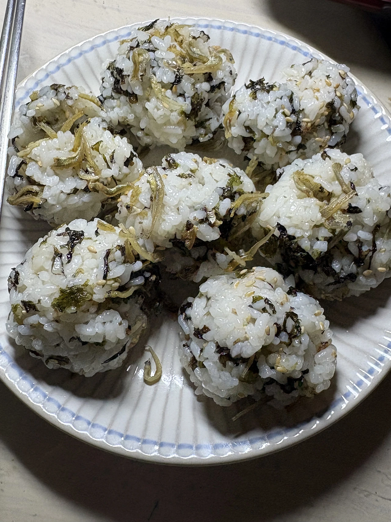 멸치랑 김가루 뿌려서 만든 주먹밥 야식으로 먹은