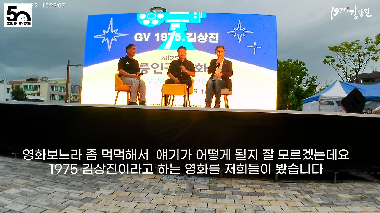 저희 영화 상영해주셔서 고맙습니다. 강릉으로 초청하시고 온갖 후의로 일상콘텐츠 만들어 주셔서 고맙습니다. 김중남 조직위원장과 정근우 김상진기념사업회 회장과 진행한 <1975.김상진> 감독GV 촬영본을 1부 2부로 설계하고 제1부 작업을 마쳤다.