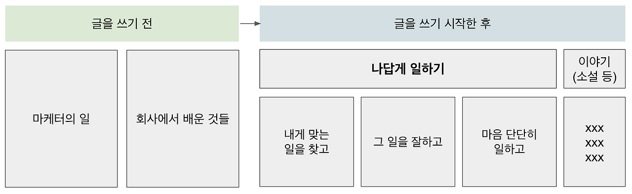 글을 쓰기 전에는 어렴풋이 마케터의 일에 대해, 그리고 회사에서 몸으로 부딪히면서 배운 것들을 정리하고 싶다는 생각만 가지고 있었다. 그런데 글을 5년간 써오면서 내가 왜 마케터의 일을 쓰고 싶어 하고, 왜 회사에서 배운 것들을 쓰고 싶어 하지? 를 고민하다 보니, 이제는 내 머릿속에 이런 글감이 있다는 것을 깨달았다.