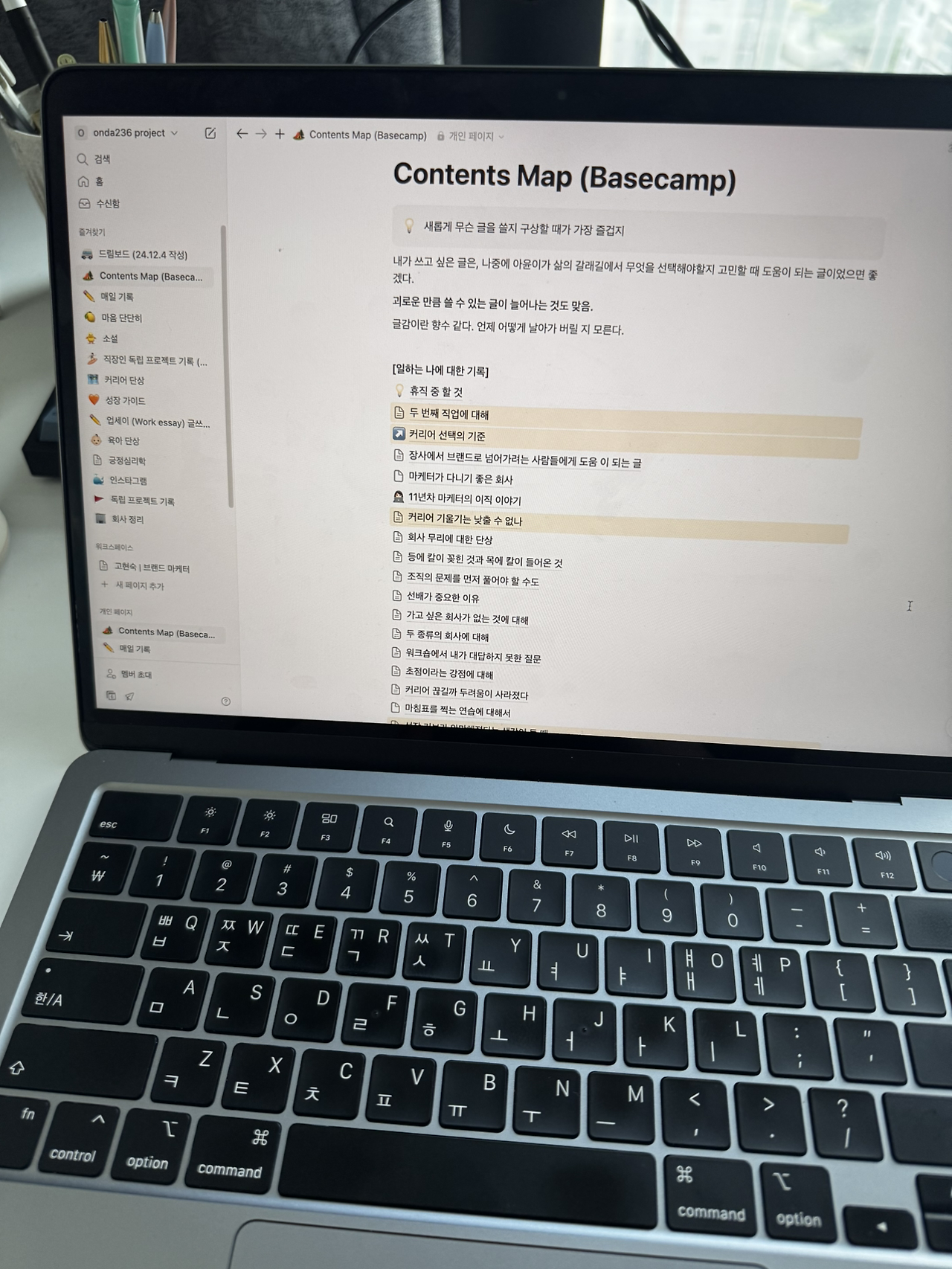 여러 채널에 생각나는 대로 남기다 보니, 더 중요한 것은 주기적으로 이 메모들을 정리하는 시간을 갖는 것이다. 내가 가장 좋아하는 시간인데, 몇 개월 치 기록을 다시 읽으면서 하나의 주제로 엮이는 것이 있는지를 본다. 콘텐츠맵이라고 이름 붙인 노션 페이지에, 글 하나로 풀 수 있는 메모가 있다면 페이지를 하나 만들고, 그 안에 짧은 기록들을 옮겨둔다. 콘텐츠맵은 내가 가지고 있는 글감들, 아직 특정 주제로 묶기 어려운 글감들이 둥둥 떠있는 아이디어의 바다다. 여기에 있는 글감들 중에 몇 개는 바로 글로 쓸 수 있는 경우도 있지만, 어떤 글감들은 더 필요한 소재들을 찾느라 쓰지 못하고 몇 년 동안 콘텐츠맵에 그대로 두기도 한다. 나는 이걸 숙성의 시간이라고 부르는데, 써야 하는 글감들을 정리해 둔 채 내 경험에서 더 맞는 소재들을 만날 때까지 묵혀둔다. 내가 글로 써보면 좋겠다고 생각한 고민이 있고, 몇 년 뒤에 비슷한 고민을 가지고 있는 사람을 만났는데, 나도 모르는 새에 내 안에 해결책이 있다는 것을 스스로 깨달으면서 글을 완성했던 경험이 더러 있었다.