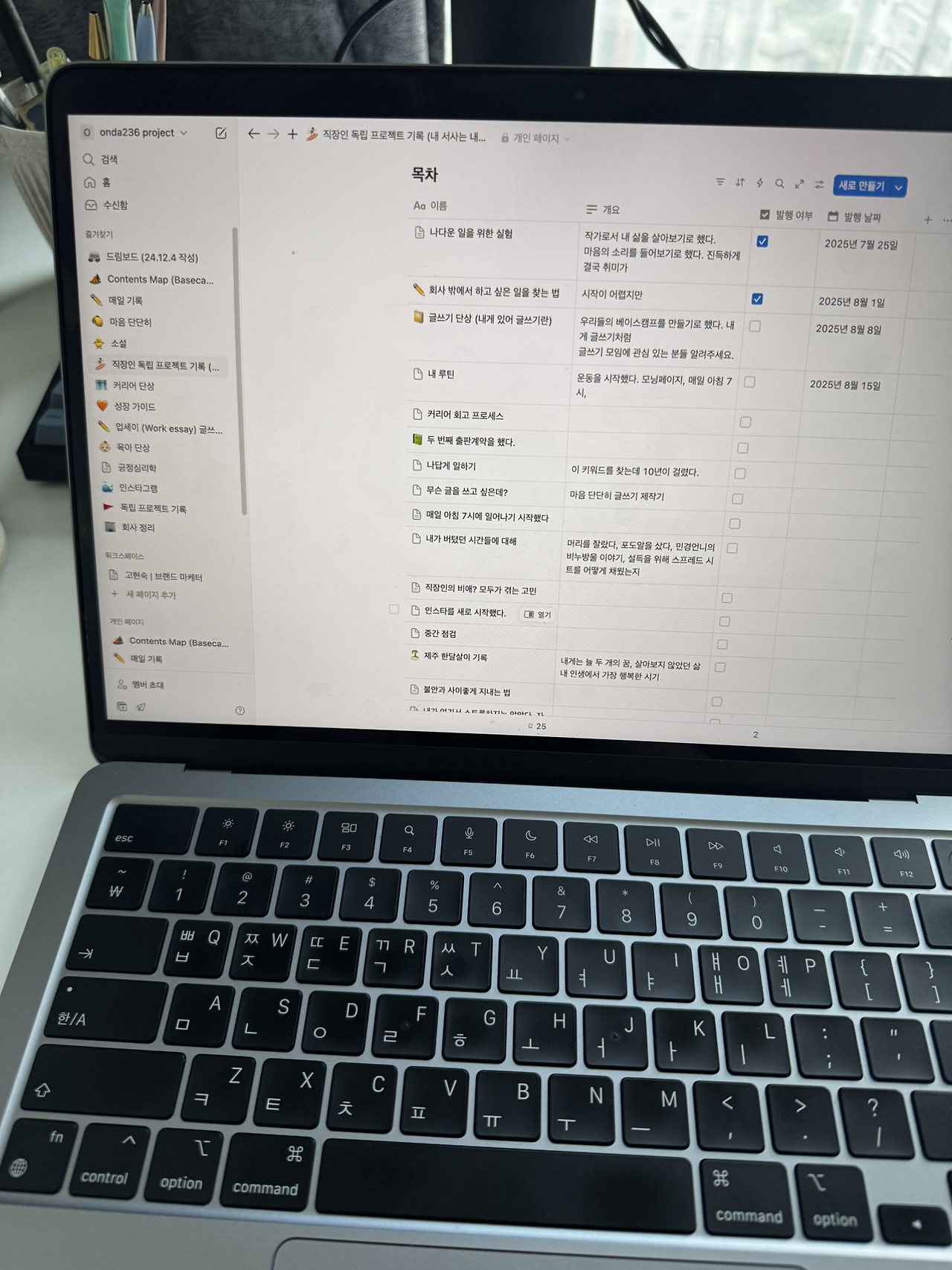 그리고 이 노트를 보면서 이제는 다시 노션 페이지를 펴놓고, 노트에 써놓은 내용을 구조화되도록 옮겨 쓴다. 노트에 쓴 내용을 옮겨놓으면 글의 60~70%는 완성이 되어있는데, 여기까지가 쓰기 단계다. 24년까지만 해도 주말에 각을 잡고 썼는데, 25년부터는 매일 1시간씩 그냥 여러 글감들 중에서 소재가 많이 찾아졌고, 내가 마무리지을 수 있겠다 싶은 글들이 있으면 하나씩 잡아서 쓰고 있다.