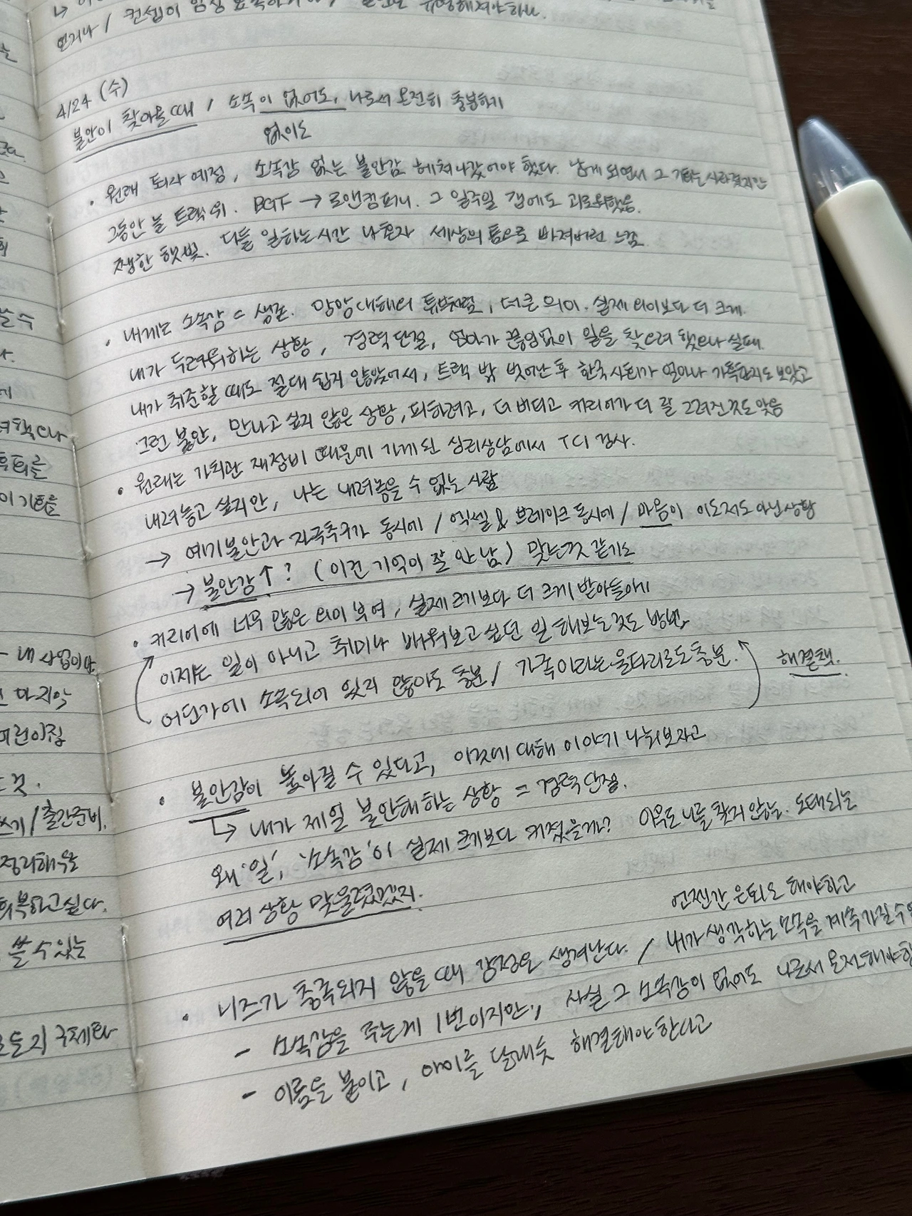 다양한 채널들에 짧은 문장들을 남겨놓는다. 노션에 짧은 기록을 남기거나, 카카오톡 나에게 채팅하기에 남겨놓거나 혹은 아이까지 재우고 모든 일정이 끝난 밤에 다이어리를 쓸 수 있는 시간이 생기면 다이어리에 지금의 생각들을 털어놓는다. 공통점으로는 바로 손에 잡히는 대로 쓴다는 것이다.