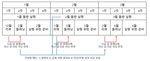 연간 플래닝에 맞춰 실행도 하고, 리뷰도 해야 하므로 실행과 리뷰가 진행되면서, 비즈니스의 변화는 계속해서 발생하므로 연간 플래닝을 기반으로 월간 플랜을 디벨롭하는 것이 필요하다. 내가 지금 3월을 산다 치면, 3월을 실행하면서, 2월 리뷰를 진행하고, 4월 플래닝을 하며 (연간 플래닝에 기반하여), 4월을 실제로 가기 위해 필요한 메시지 개발이라던지 광고 북킹이라던지 등등의 일을 해야 한다. 그러면서 추가로 월별 목표를 달성하지 못할 것 같은 상황이 그려지면, intervention plan에 대해서도 추가로 그려야 한다.