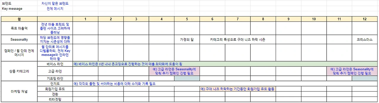그래서 최종 완성된 연간 플래닝의 포맷을 보자면 다음과 같다. 예시 포맷이라 숫자는 없이, 들어가야 할 요소에 대한 내용만 채워 넣었지만, 실제 연간 플래닝은 이 모든 것이 숫자와 함께 기록되어있다.
