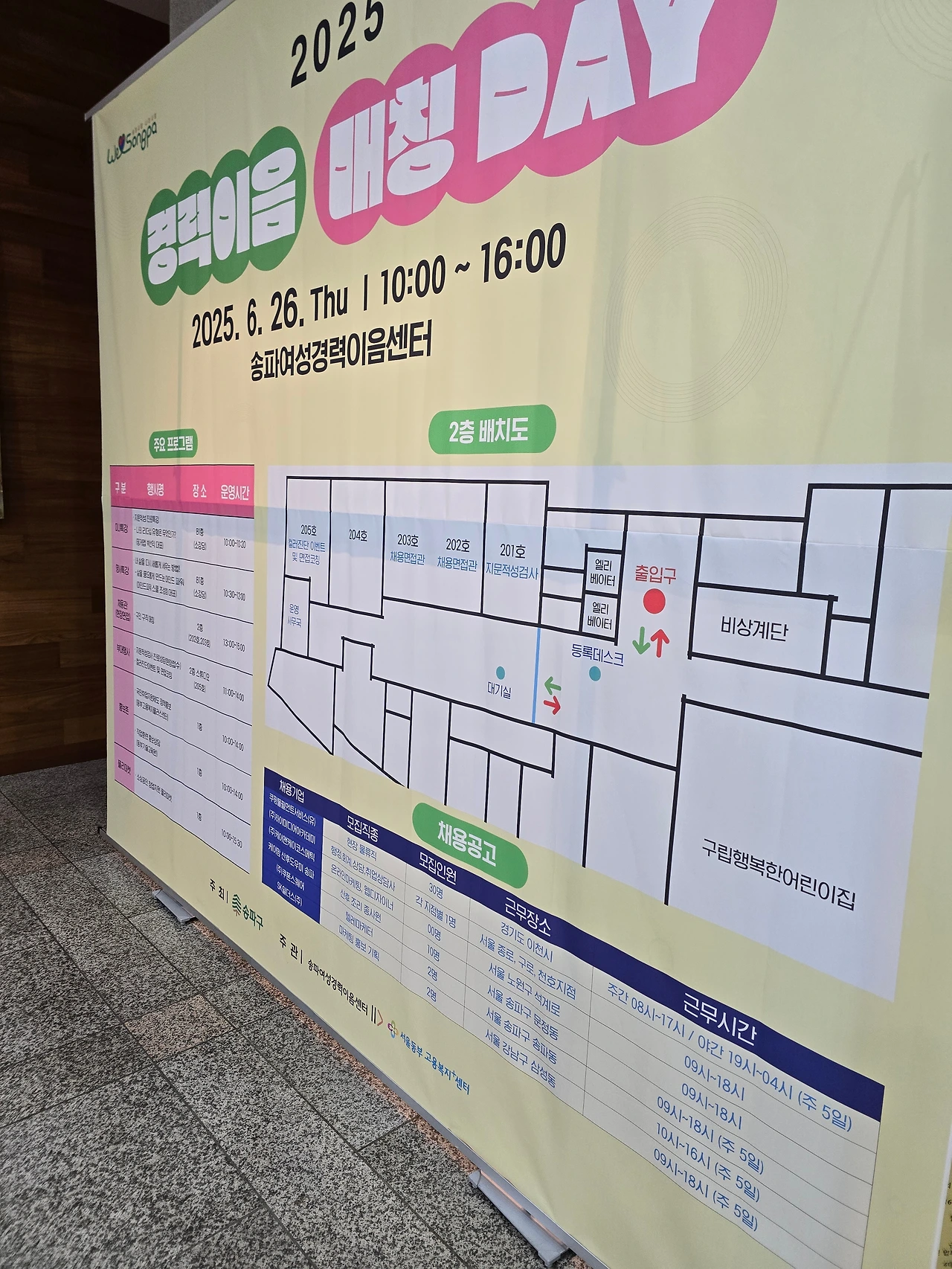 오늘은 경력단절 여성을 위한 경력 이음 일자리 매칭이라는 구인구직 행사에 참여했다. 난 경력 단절까지는 아니지만 일하고자 하는 직종에 경력이 없으니 또 떨어질 예정이다.