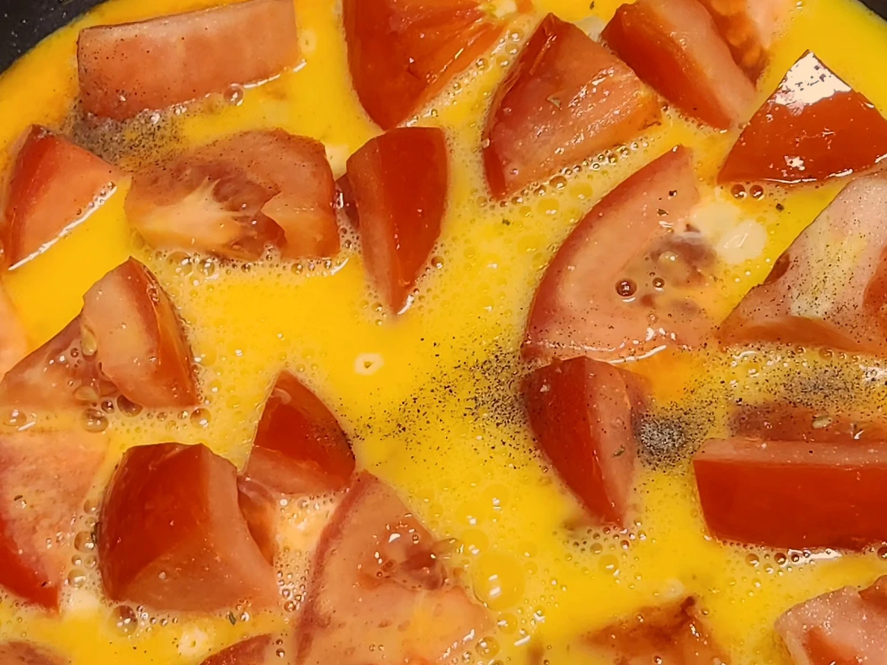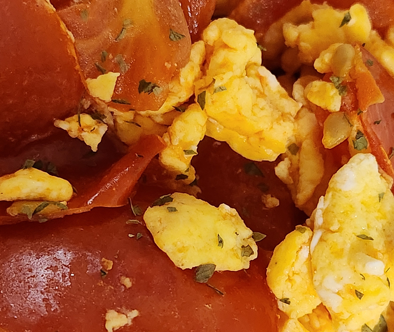 잘 익은 토마토를 뭉텅뭉텅 썰고 올리브 유에 볶다가 풀어놓은 계란에 맛술과 소금 조금 넣어 한번 더 섞어 토마토랑 만나게 해 준다