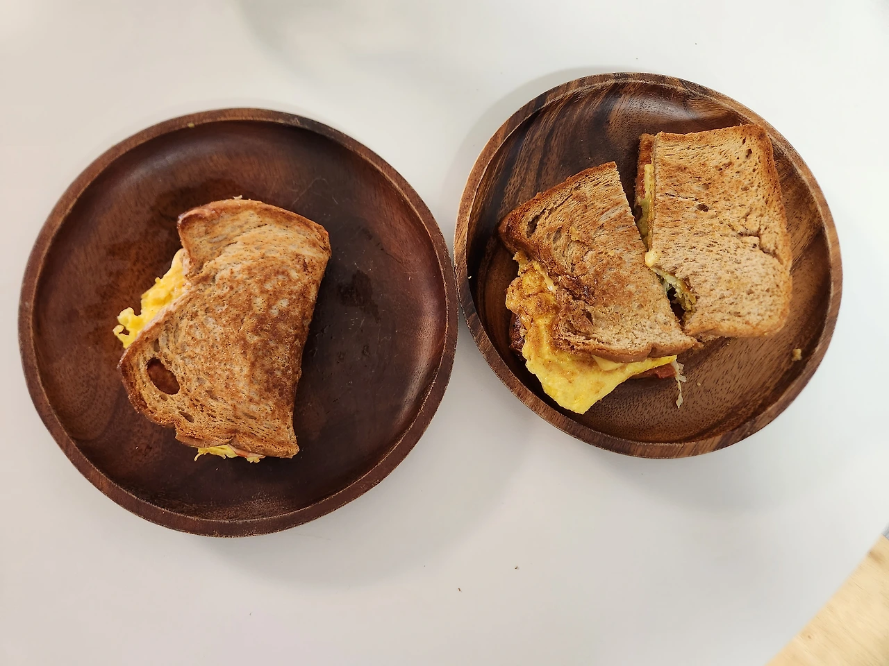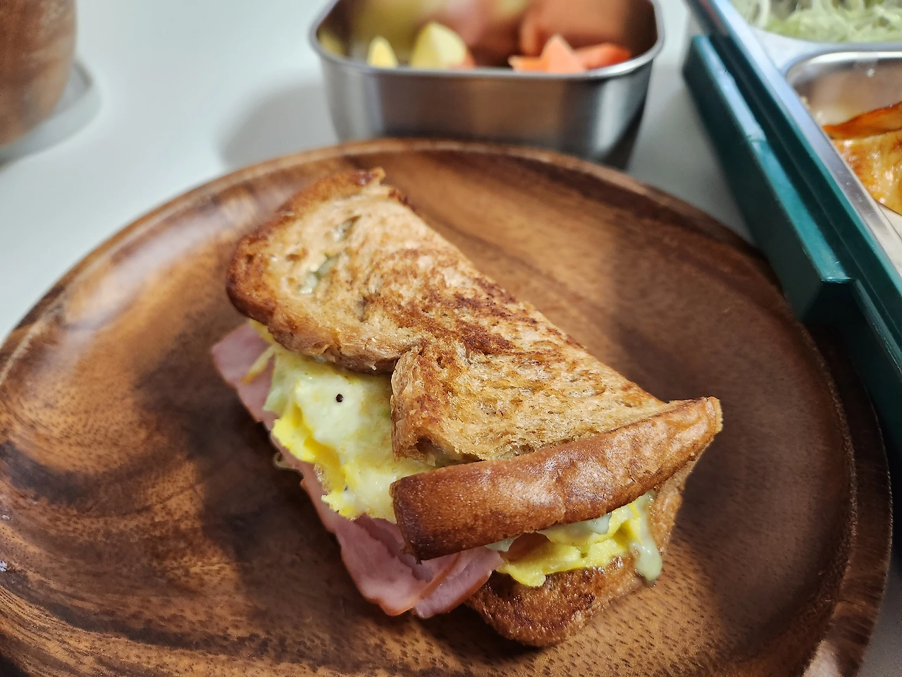 나무 접시에 있는 빵은 방학이라 늦잠을 자고 있던 큰 아이 점심용 샌드위치