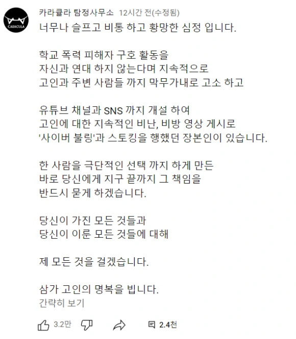 여기까지만 하려고요. 나의 아픔을 알렸고 그 아픔을 통해서 사람들이 많이 응원해줬고, 나는 잘 모르겠지만 하나쯤 바뀌지 않았을까요... 나 하나 때문에 일어난 일이니까 나만 없어지면 되는거 아닌가..
