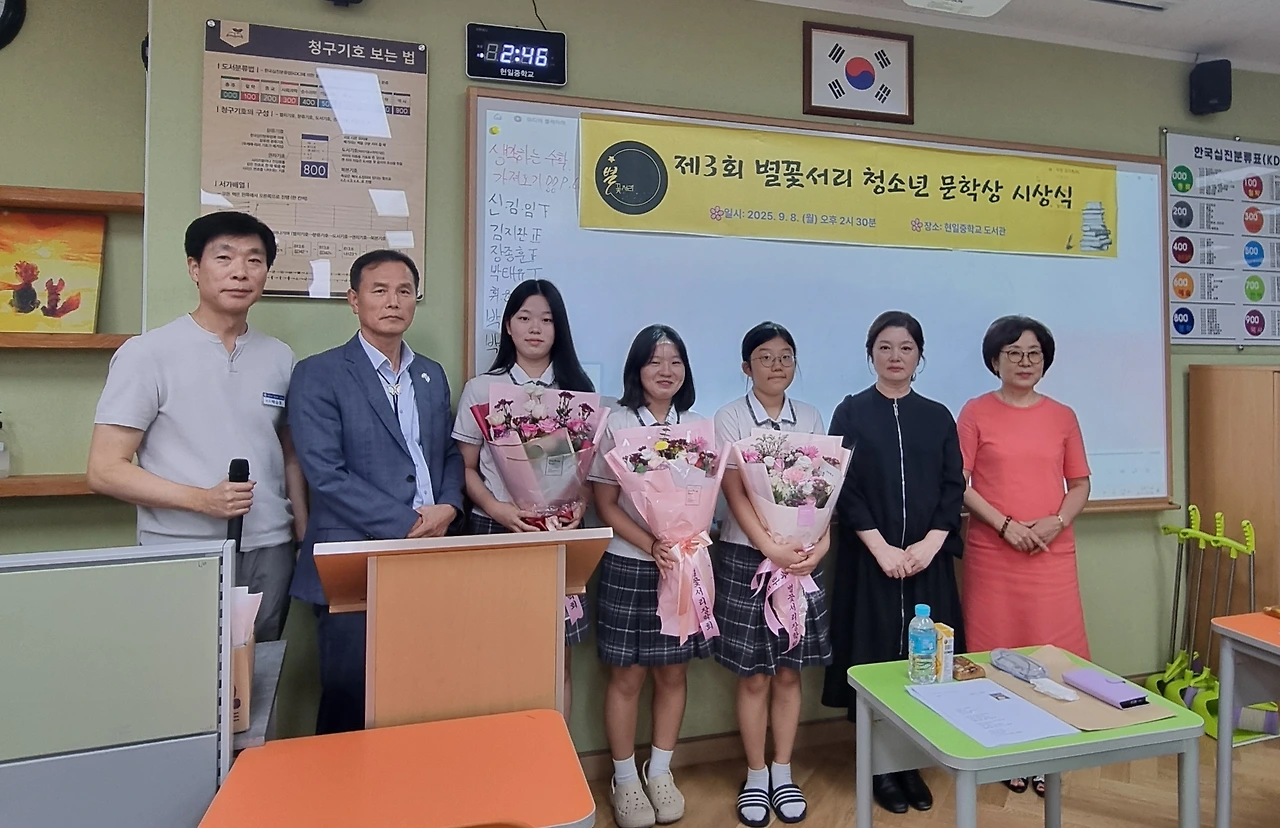 좌) 배승호 국어선생님, 김낙현 교장선생님, 강가온(3학년 최우수상) 학생, 임시은(2학년 최우수상) 학생, 김하윤(1학년 최우수상) 학생, 김미진 별꽃서리장학회장, 이현숙 제3회 별꽃서리청소년문학상 추진위원장