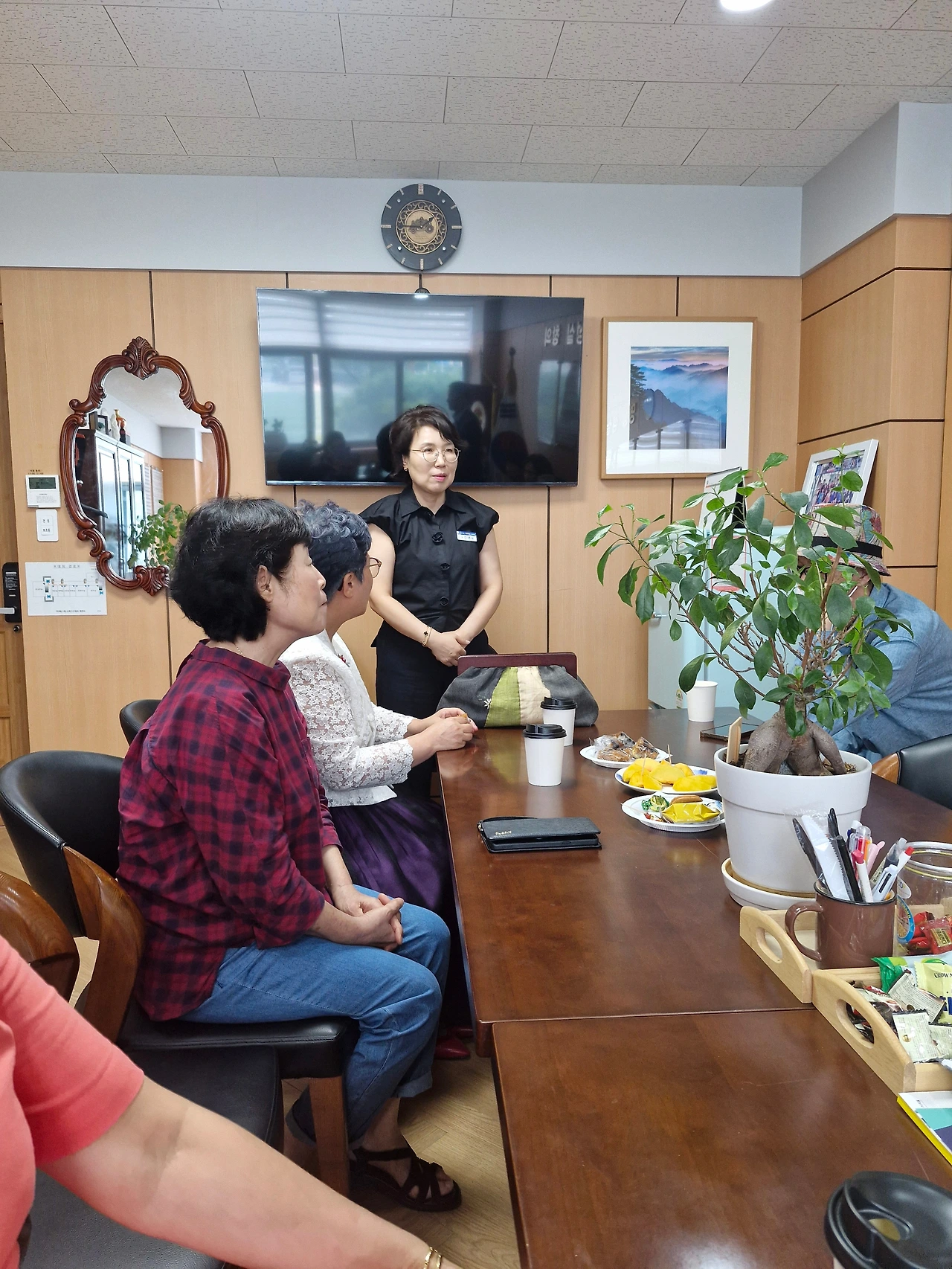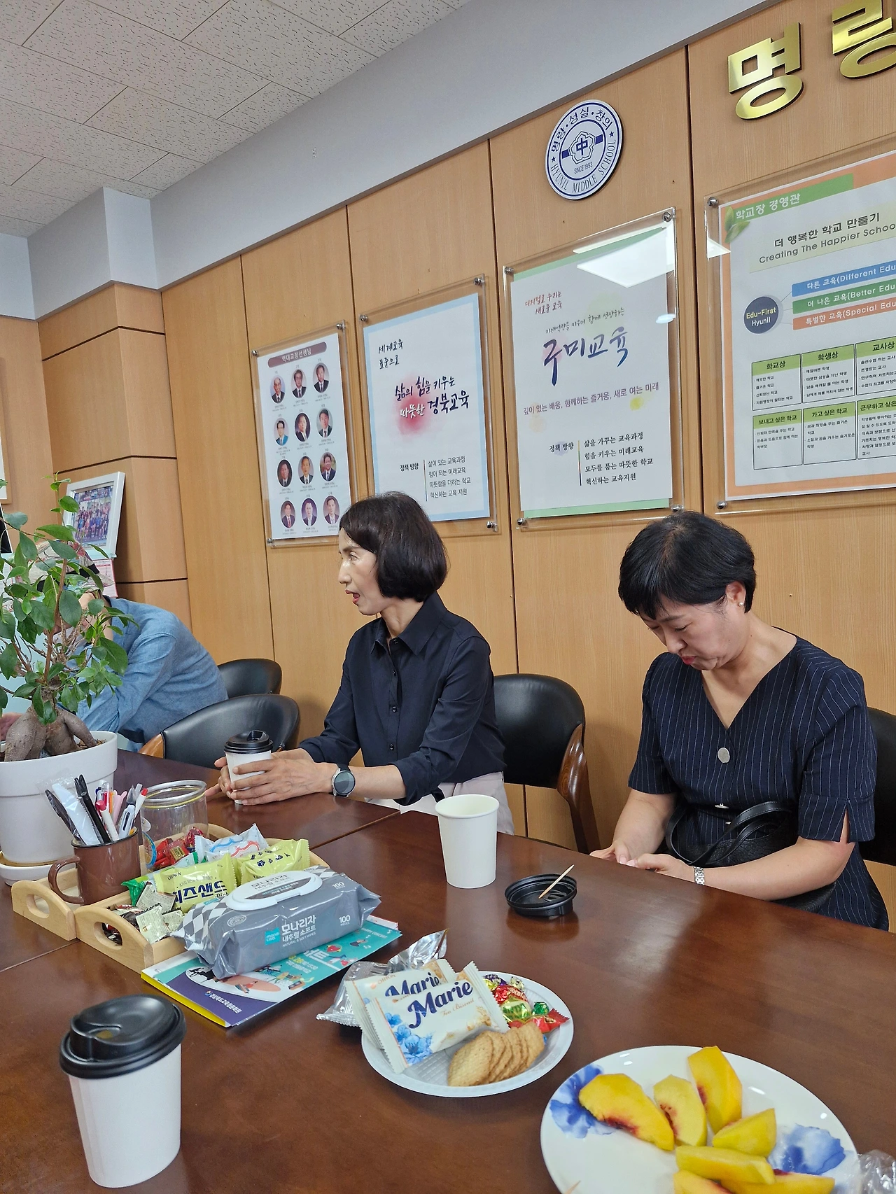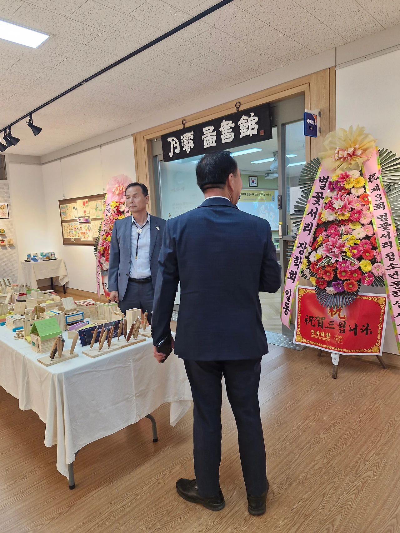 좌) 장사현 사단법인 영남문학예술인협회 이사장/우)이현숙 선생님, 조봉숙 시인, 강신영 시인, 진해숙 교감선생님
