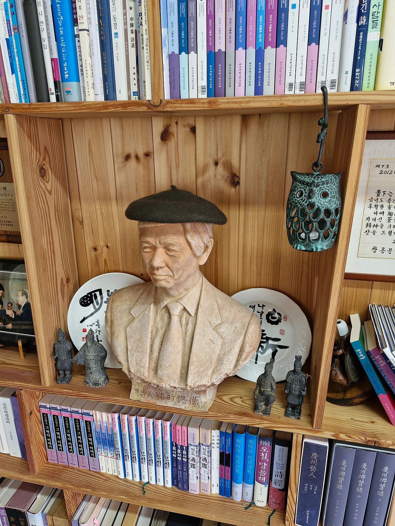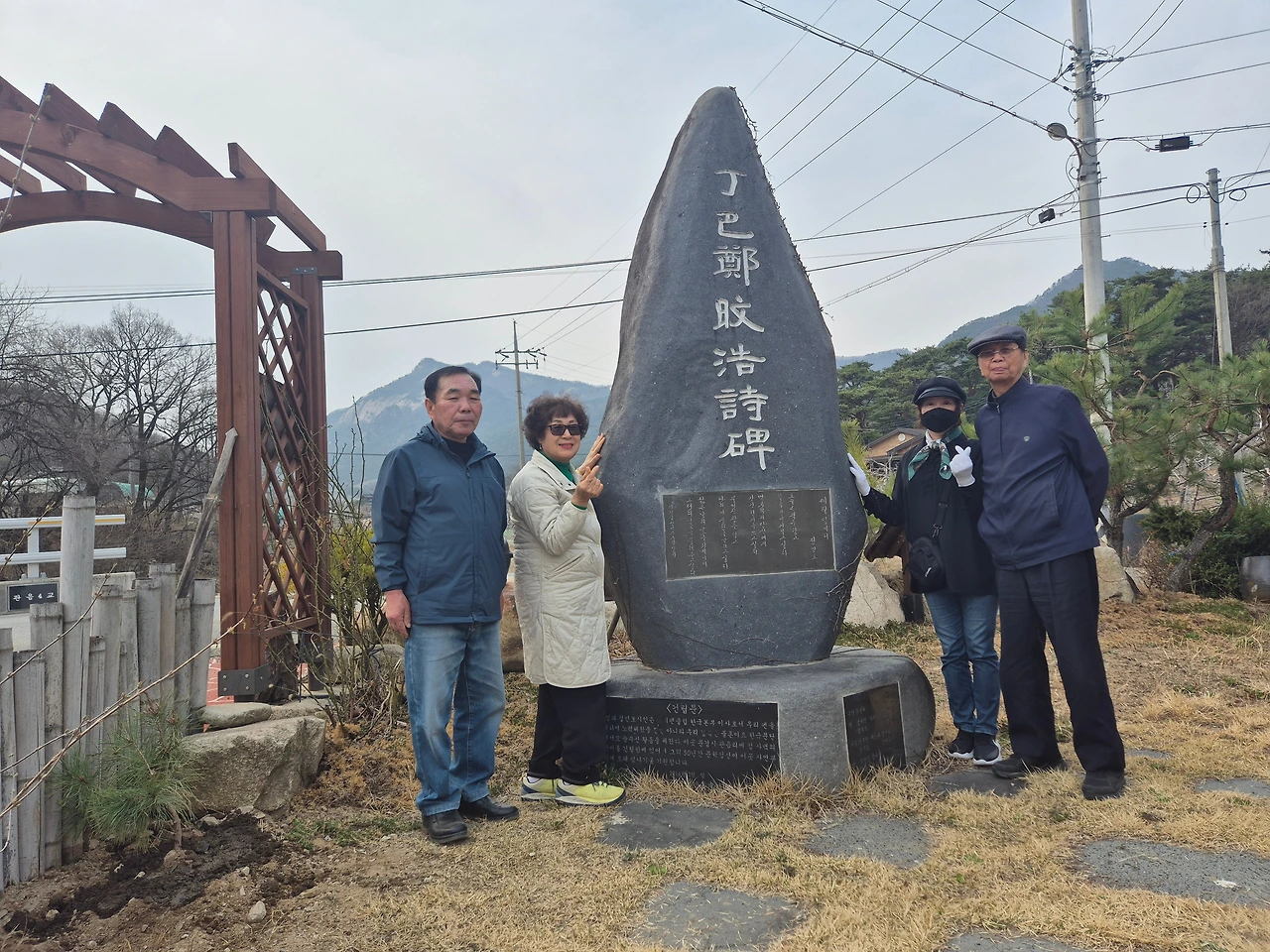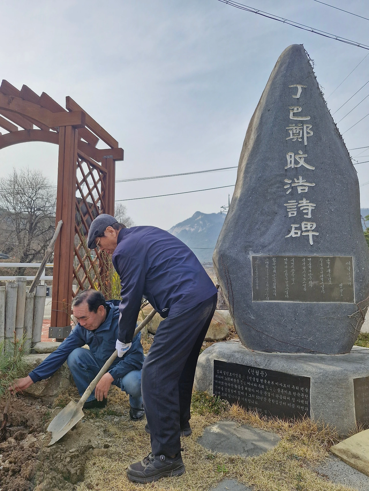 신대원 선생님은 커다란 시비 옆에 가지고 온 소나무 한 그루를 심었다. 옆에서 지켜보시던 원장님의 사위께서 흙을 고르고, 뿌리를 눌러주며, 천천히 흙을 덮는 손길이 정성스럽고 조심스러웠다. 전남원 선생님과 나는 그 작은 소나무 앞에 서서, 소나무가 잘 자라주기를 바라며 기념사진 한 장을 남겼다.