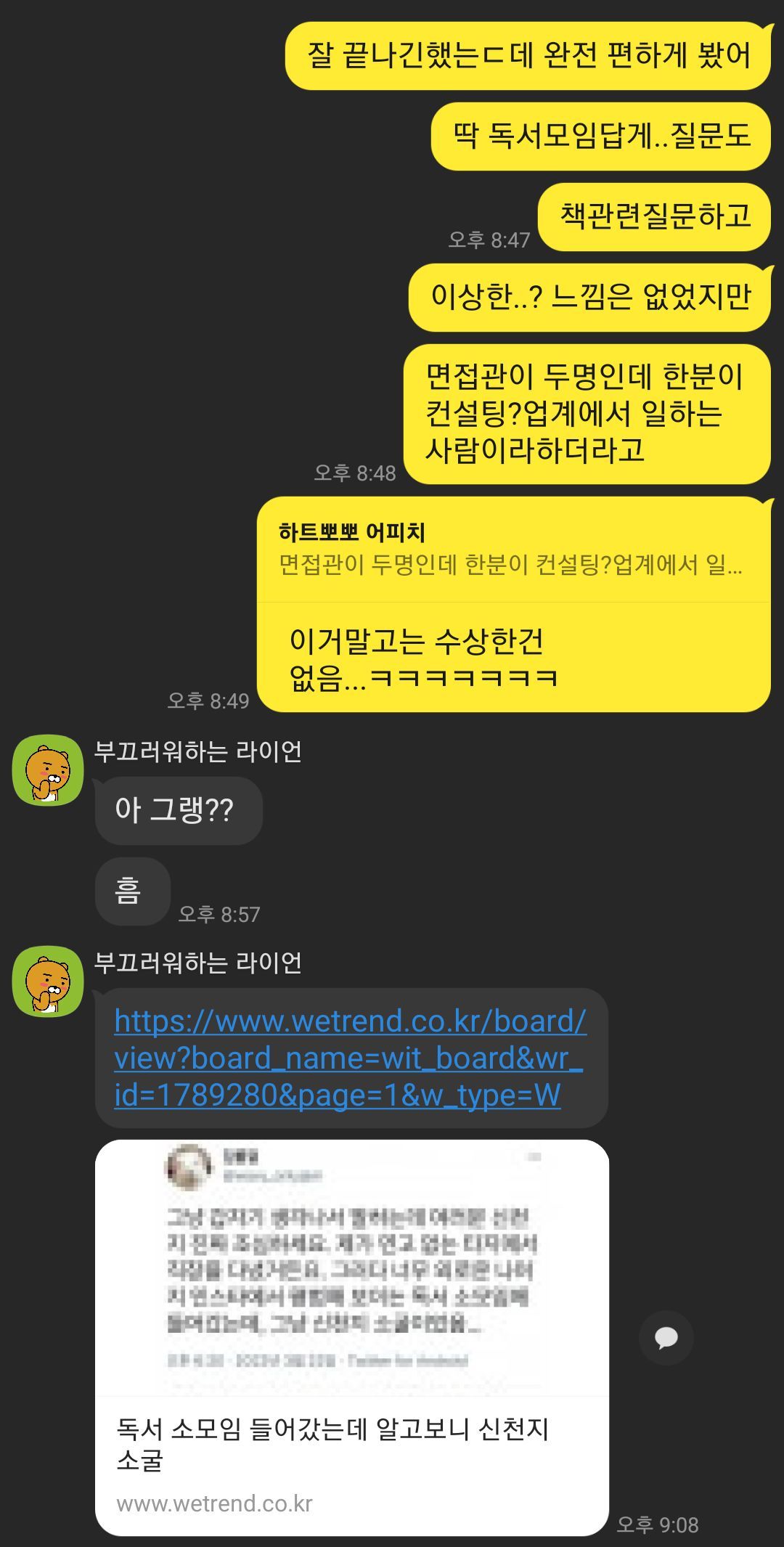 3일 전에는 독서토론동아리 면접을 보러 갔다. 이미 신천지와의 만남이 대여섯 번 있었던 나는 그래도 '이번엔 아니겠지' 하며 의심을 거두었다. 면접이 끝나고는 신앙심이 깊은 친구에게 장문의 카톡을 여러 번 보냈었다.