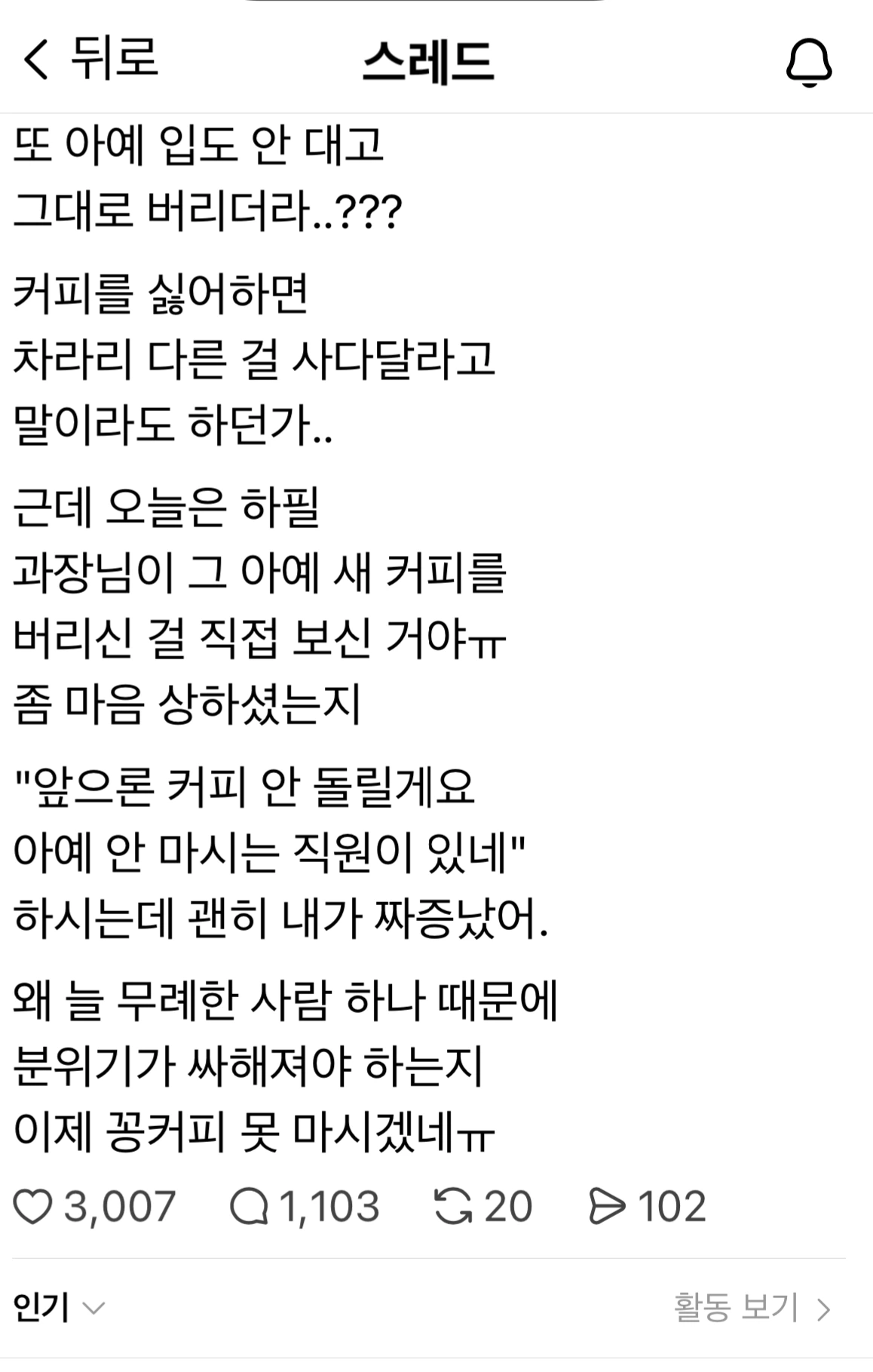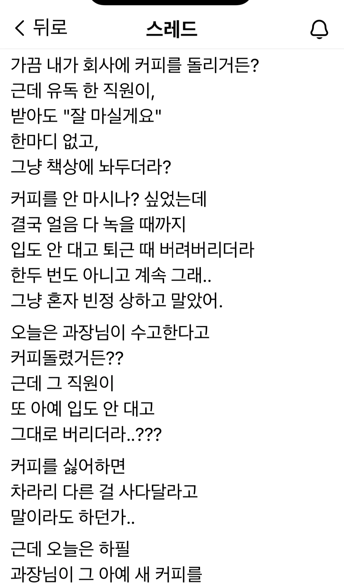"아... 엄마는 옛날 사람이라 스레드를 모르는구나. 어쨌든 커피 관련 논란 알아 몰라?"