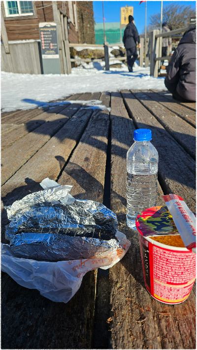 준비해 온 컵라면, 보온병의 따뜻한 물, 그리고 김밥.