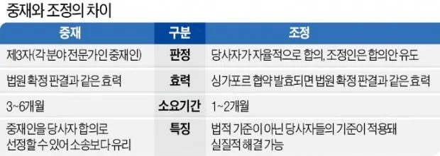조정은 당사자가 자율적으로 합의하는 방식인 반면 중재는 당사자가 제3자의 판정을 받기로 합의하고 제3자가 판정을 하는 것입니다.