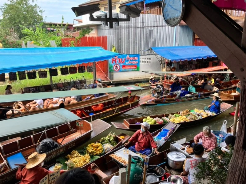 담넌사두억은 수상시장으로 유명합니다. 수상시장에서는 배 위에서 물건을 팔거나 물길 양 옆의 상점에서 물건을 팝니다.