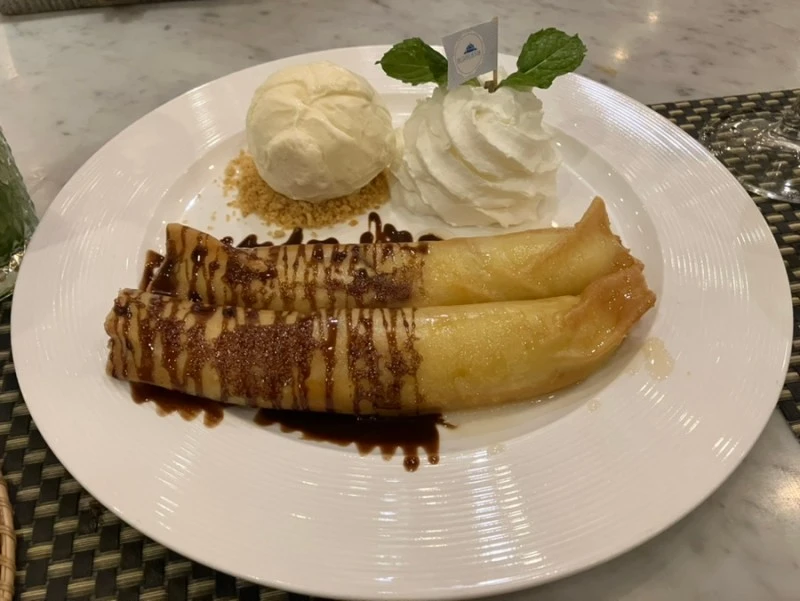 튀긴 바나나에 초코시럽, 시나몬가루를 뿌려서 아이스크림, 생크림과 함께 나오는데 함께 먹으면 정말 디저트로서 일품입니다.
