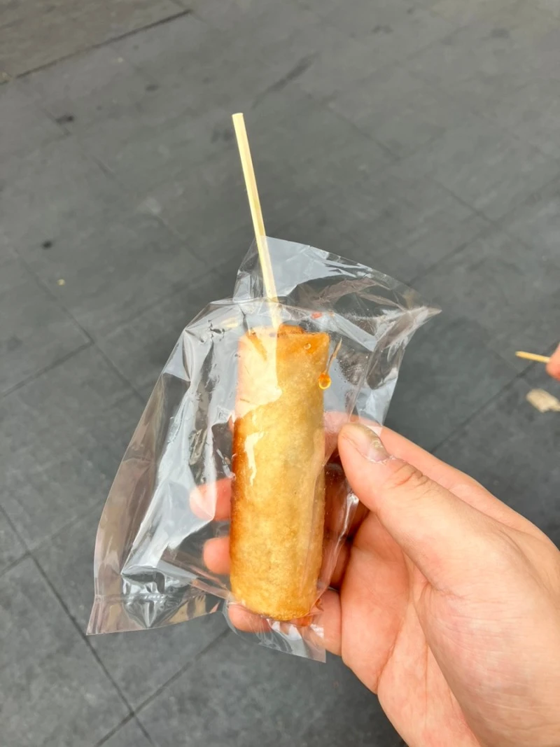 카오산 로드에서는 스프링롤과 컵 망고를 먹었고, 쩟페어 야시장에서는 해파리 꼬치를 도전해봤습니다.
