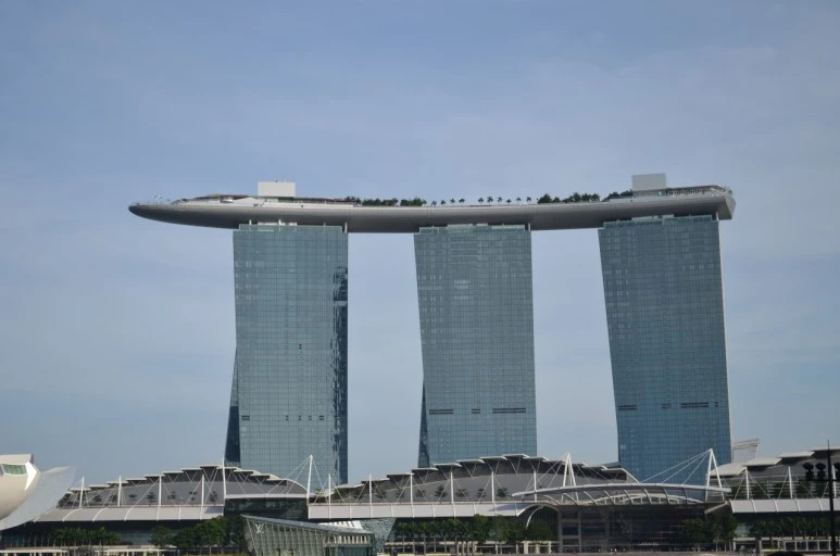 마리나베이는 보이는 저 건물 3개를 말하는데, 이 건물에서 제일 유명한 것은 바로 꼭대기에 있는 수영장입니다.