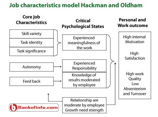 Heckman과 Oldham은 5가지 핵심직무차원이 중요한 심리상태를 유발하여, 조직구성원들이 동기부여되고, 그 결과 내재적 보상을 인한 업무수행 상승, 직무만족 상승, 이직과 결근의 감소 등의 결과가 나타난다고 설명하였다. 이때 이러한 결과는 종업원의 자존감과 자아실현에 대한 열망 정도인 성장욕구강도(Growth Need Level)에 따라 그 수준이 결정된다.