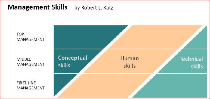 Katz는 관리층을 위와 같이 3단계로 구분하며, 최고경영층은 개념적(의사결정)기술이 가장 중요하고, 중간경영층은 인간관계 기술, 하위경영층은 전문적(직무조직) 기술이 가장 중요하다고 주장하였다.