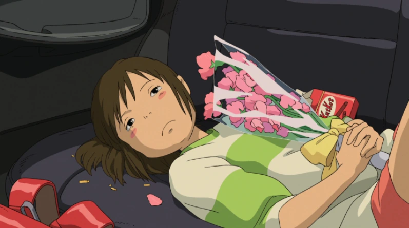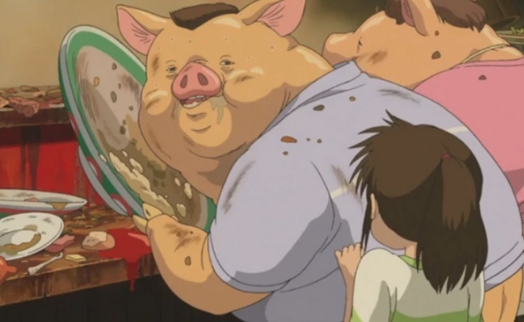 이 재밌고도 심오한 만화영화는 어떤 여자아이가 차 뒷좌석에 누워 친구가 준 환송 꽃다발을 안고 시무룩해하는 장면으로 시작한다. 그러다 이 주인공 소녀 '치히로'의 가족이 길을 잃고 대중탕이라고 적혀있는 이상한 터널을 건너게 된다. 그곳에서 맛있는 냄새가 나고 치히로의 부모님은 주인도 없는 음식점에 멋대로 들어가 허락도 없이 음식을 먹는다. 그 모습이 마치 돼지 같은데 그러다 정말 돼지가 되어버린다. 돼지로 변해버린 부모님을 보고 공황상태에 빠진 치히로는 이건 꿈이라며 현실을 부정한다.