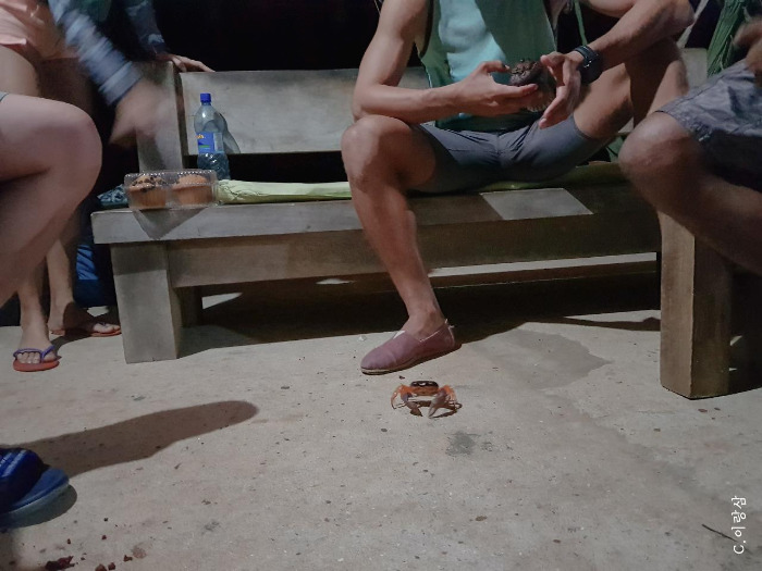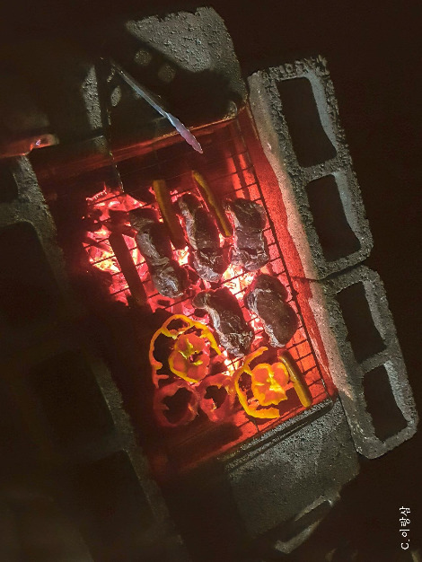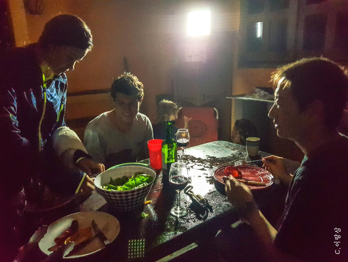 두두와 나는 핸드폰 손전등으로 바베큐 그릴과 식탁을 희미하게 밝혔다. 이딸로씨는 어딘가로 사라졌다가 커다란 캠핑용 전등을 들고 나타났다.