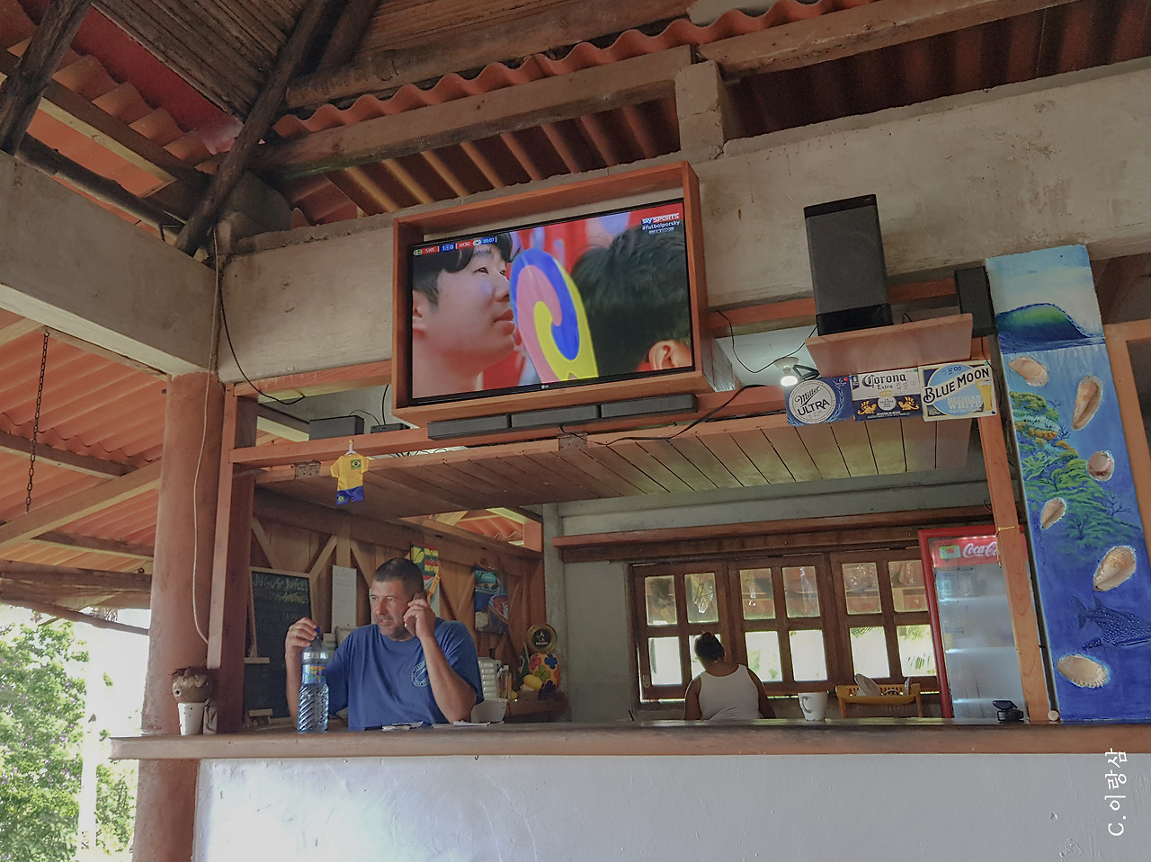 아, 마침 월드컵 본선 경기가 시작한 시기였다. 레스토랑을 겸한 공용 공간엔 작은 텔레비전이 켜져 있었고, 한두명 수영복을 입고 티비에 잠깐씩 집중을 했다. 누군가 축구 중계를 넉놓고 보고 있다치면 자기 국적의 대표팀이 뛰고 있었다. 우린 한국과 스웨덴의 16강전를 그 작은 티비로 지켜봤다. 주변에 모인 사람들은 '너희 국가 대표팀'의 경기력이 좋은지, 결과는 어떻게 예상하는지 물어왔다. 우리는 ... 축구에 열과 성을 다하는 이 중남미 문화권에서 산 이래로 그들과 축구에 대한 깊은 대화에 휘말리고 싶지 않았다. 그래서 우리 못해 라고 딱 잘라 말했다. 그러면 예상과 같이 더 이상 묻지 않곤 했다. ㅎㅎ 대답처럼 경기는 지지부진하게 이어지다가 한 점 차이로 졌다. 경기에 무심한 척 했지만 한국팀의 패배가 씁쓸한 건 어쩔 수 없었다.