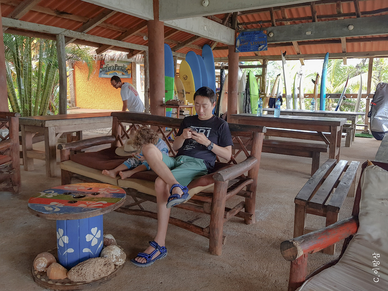 산타 까딸리나에서의 삼박 사일의 일정은 단순했다. 아침 식사를 하고 나면 바다에 나갈 준비를 했고, 파도 위에서 '서핑' - 파도 좀 타보려고 오만 노력을 다- 했으며, 한번의 세션이 끝나면 숙소로 돌아왔다. 그리고 오후 바닷물이 빠질 때쯤 덜 마른 수영복을 입고 다시 바다로 갔다. 그러니까 바다에서 보내는 시간과 그 전과 후의 과정이 이번 여행에서 한 일의 전부였다. 짜투리 시간엔 숙소에서 하릴없이 시간을 보냈다. 물놀이 후 늘어지는 낮잠을 자고, 파트리시아와 샘과 간식을 나눠 먹으며 몇 마디 나눴다. 그것도 아니면 더 무의미하게, 맥주 한 캔 따서 먹고 해먹에 누워 대롱대롱 흔들렸다.