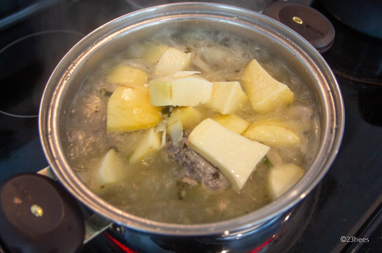 6. 물을 버리고 마를 넣어서 부드러워질 때까지 끓인다. (불의 세기에 따라서 20분 미만)