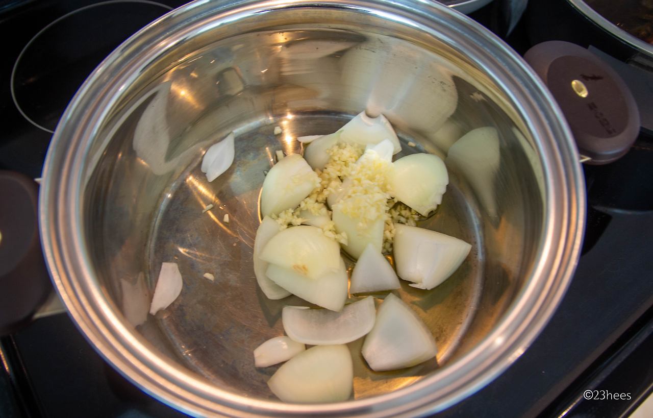 1. 속 깊은 냄비에 올리브유 2숟가락과 다진 마늘, 양파를 넣고 살짝 볶는다.