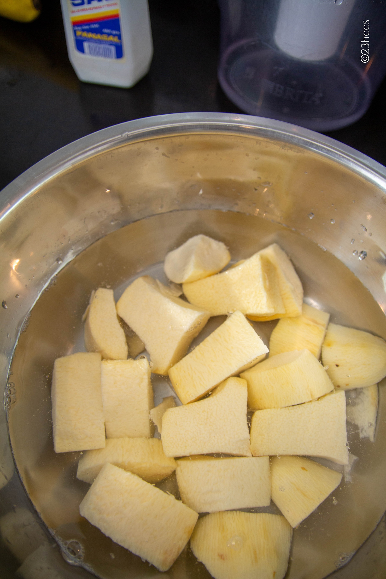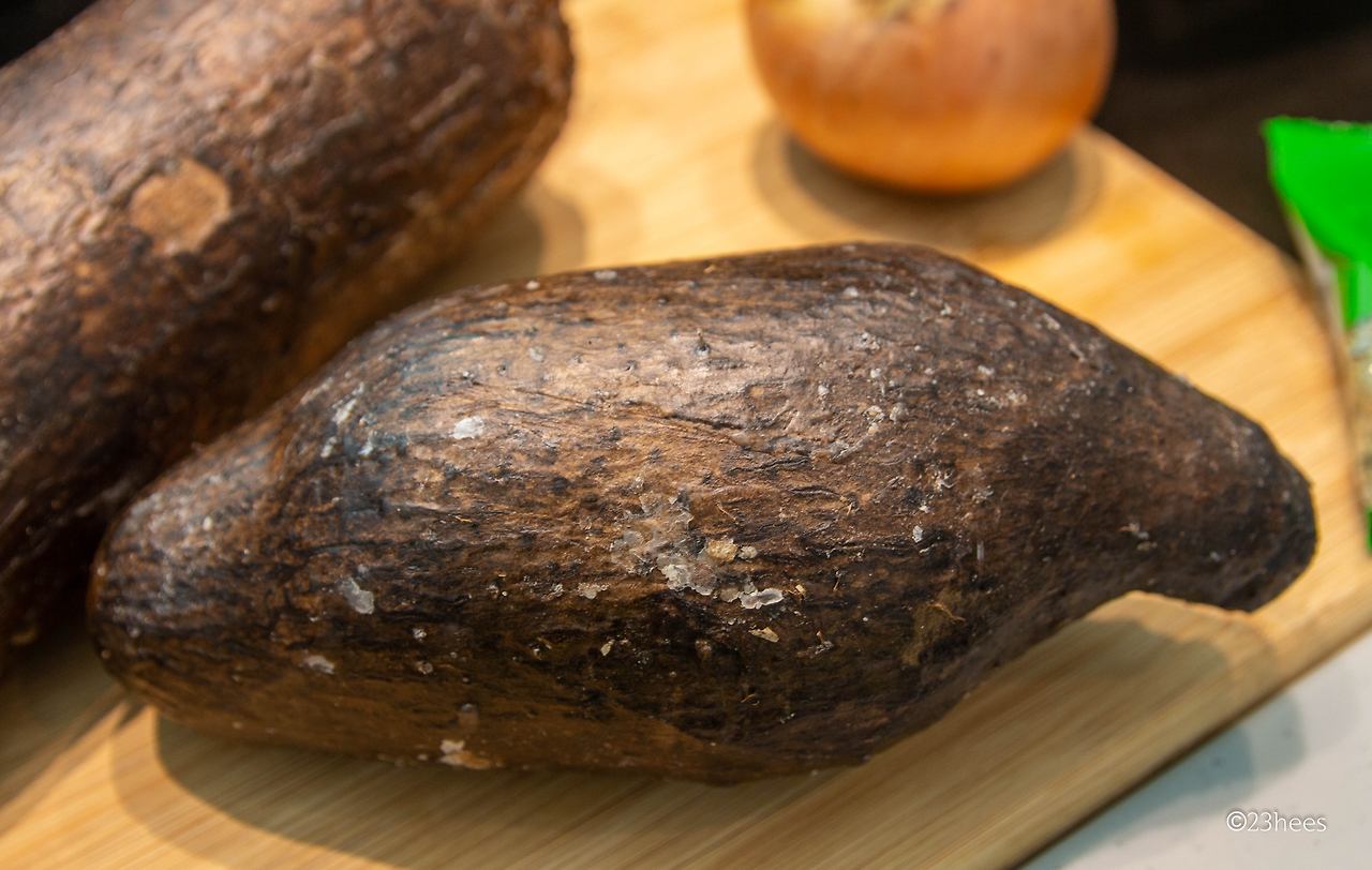 주재료는 생닭과 냐메라 부르는 마 정도로 준비할 게 얼마 없다. 내가 갔던 식당에서는 마 뿐만이 아니라 유까와 옥수수를 다 넣었는데, 파나마 집밥 버전 산코초는 이렇게 마만 있어도 충분하다. 마의 껍질에 닿으면 피부가 간지럽기 때문에 장갑을 끼고 껍질을 두툼하게 제거했다. 그리고 아주 큼지막하게 썰어서 물에 담가둔다.
